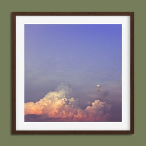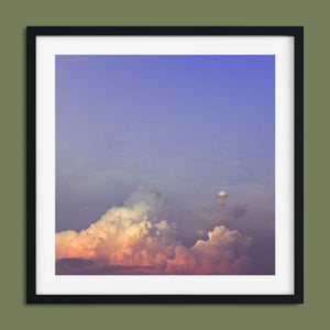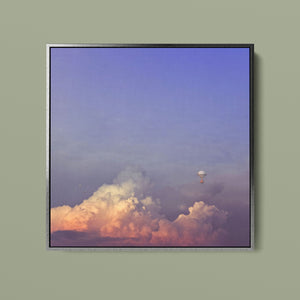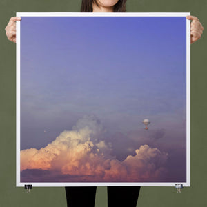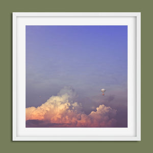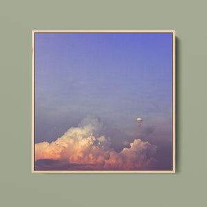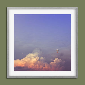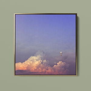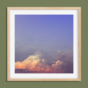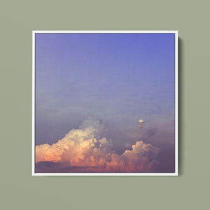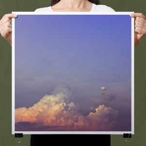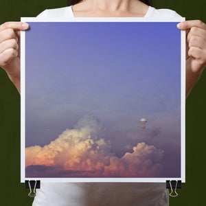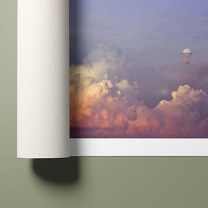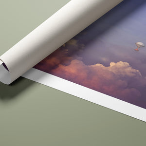 "Above the Clouds" presents a dreamy fantasy scene with a vintage airship floating through a tranquil evening sky. The artwork employs soft purple, pink, and rose gold tones, capturing a serene and adventurous atmosphere. The minimalistic approach and gentle light enhance the feeling of calm and exploration in this imaginative illustration.