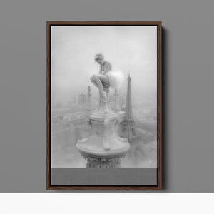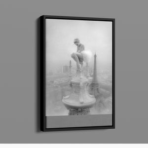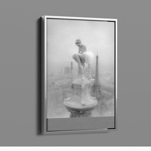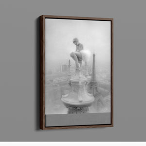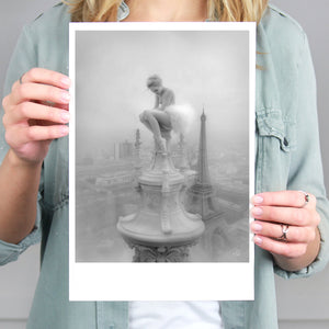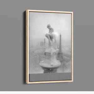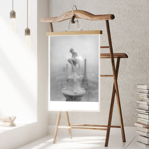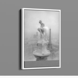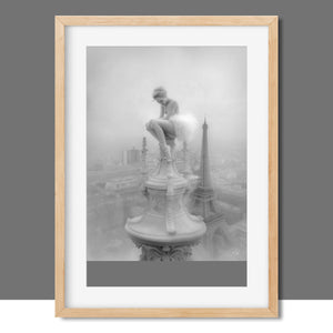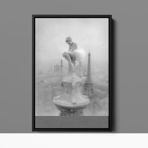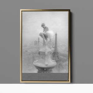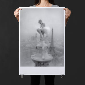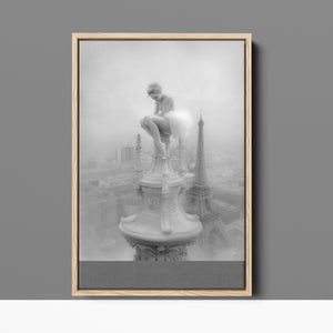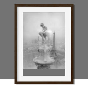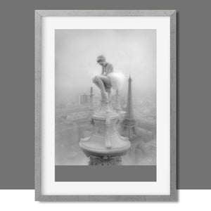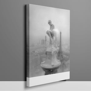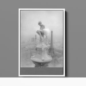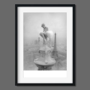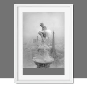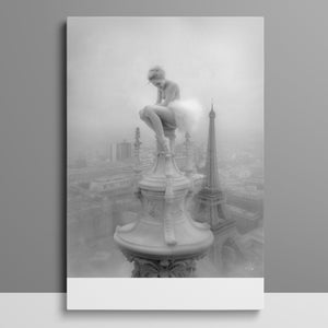 This captivating image from the Vertige - En Pointe collection showcases a ballerina in a dreamy, contemplative pose as she sits atop a tall decorative spire overlooking the Paris skyline. The dancer's graceful silhouette is juxtaposed against the iconic Eiffel Tower and the sprawling cityscape below. The photograph captures the juxtaposition of human artistry with architectural grandeur, creating a visual metaphor for rising above the ordinary. The ballerina's thoughtful stance, perched high above the city, evokes a sense of solitude and reflection amidst the bustling metropolis.