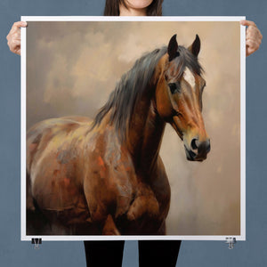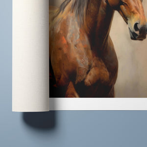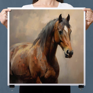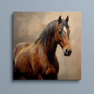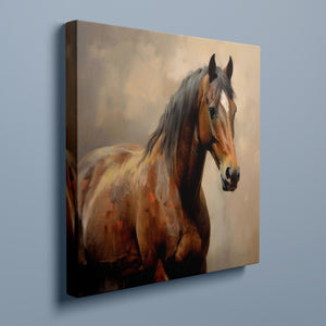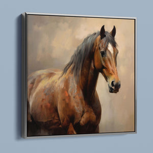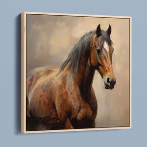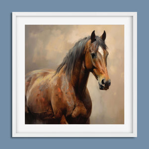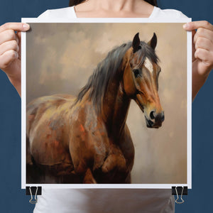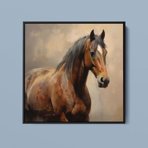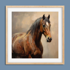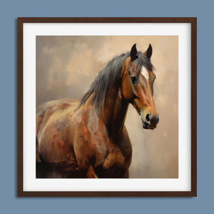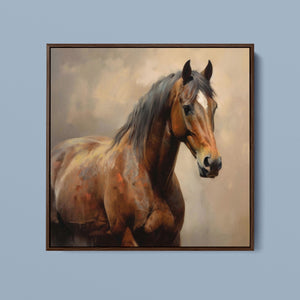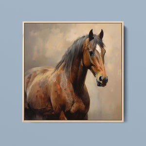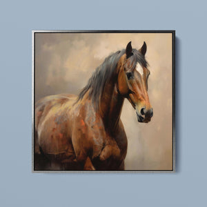 Classic oil painting of a brown horse with a white marking, highlighting its grace and the timeless beauty of equestrian life.