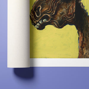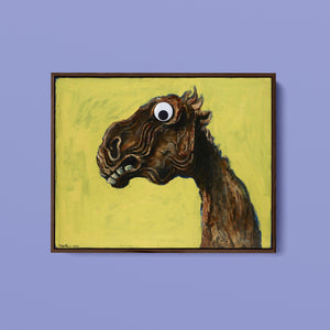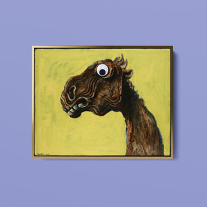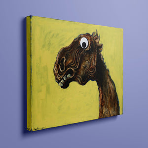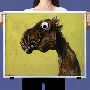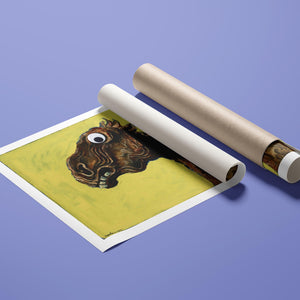 "Apocalyptic Horse" by Albert Tuckergoogly is a striking 5x4 horizontal painting that combines vintage charm with whimsical humor. Created in 1945, this artwork features a surreal depiction of a horse with a googly eye, set against a bold yellow background. The piece's abstract and distorted style, rooted in expressionism, delivers a unique and playful take on apocalyptic themes. With its blend of retro art and contemporary flair, this painting adds a touch of humor and surrealism to any collection or space.