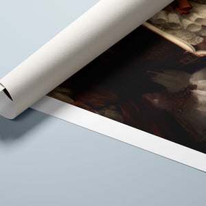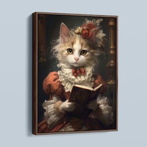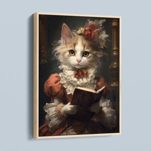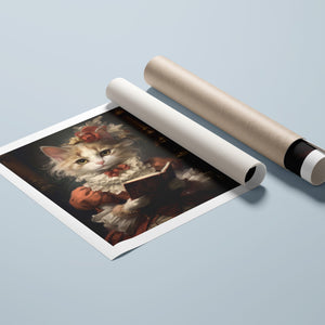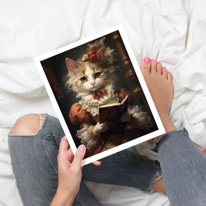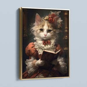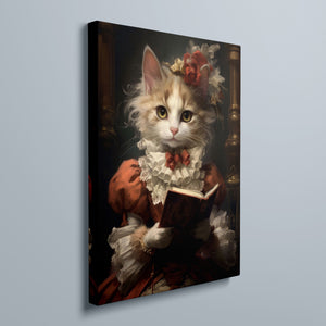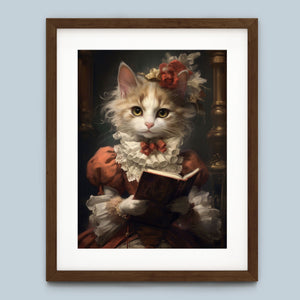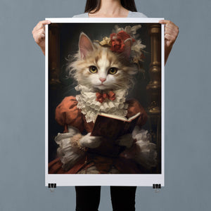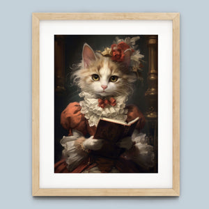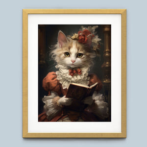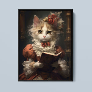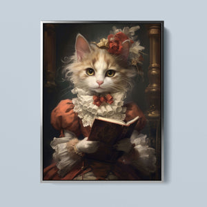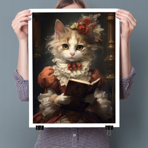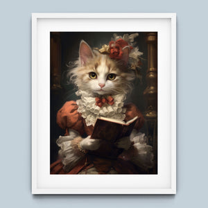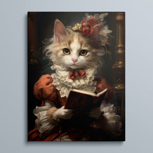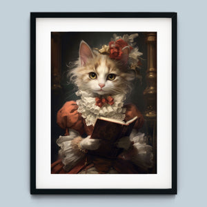 Arista Kat - Grace showcases a sophisticated anthropomorphic cat dressed in an elegant vintage outfit. The cat, adorned with a floral headdress and lace collar, is depicted reading a book, exuding a cultured and refined demeanor. The portrait blends fantasy elements with retro charm, highlighting the cat's intelligence and grace in a detailed and whimsical style.