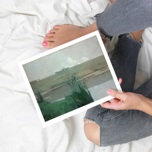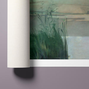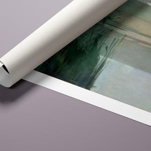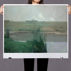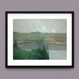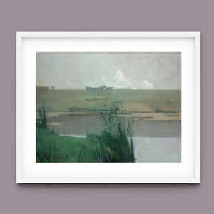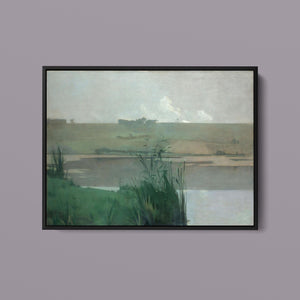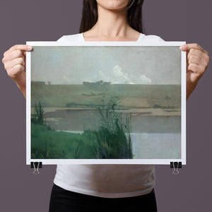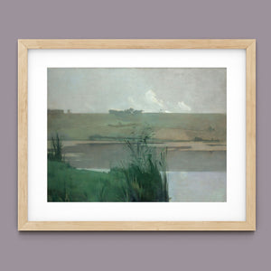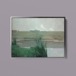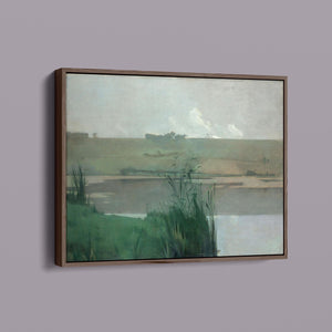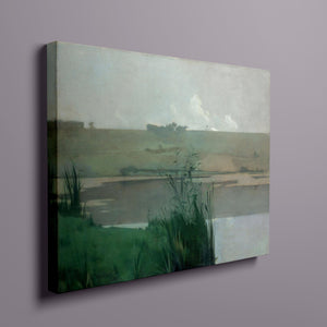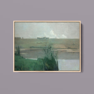 Experience Arques-la-Bataille by John Henry Twachtman, a classic late 19th-century Impressionist painting that beautifully captures a tranquil rural landscape. The artwork features a serene river scene with subtle reflections, soft clouds, and a subdued pastel palette, evoking a sense of calm and natural beauty.