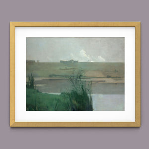 Late 19th-century Impressionist painting "Arques-la-Bataille" by John Henry Twachtman, depicting a tranquil river and rural landscape with soft pastel colors and subdued tones.