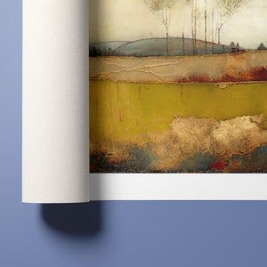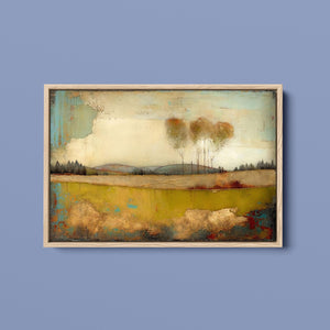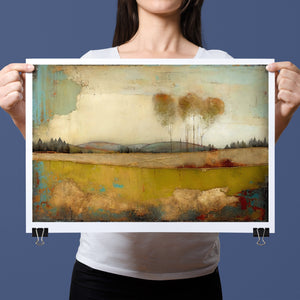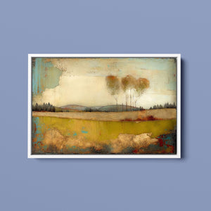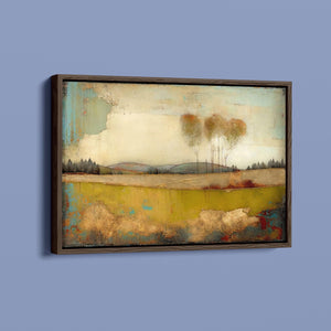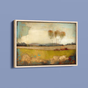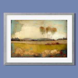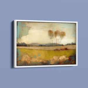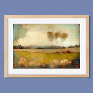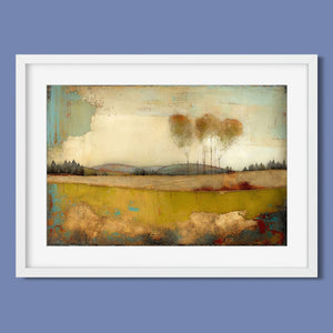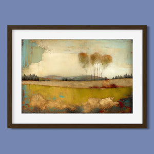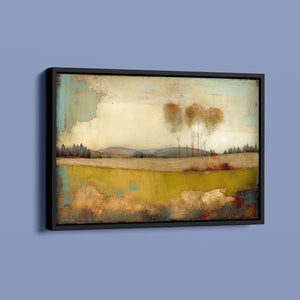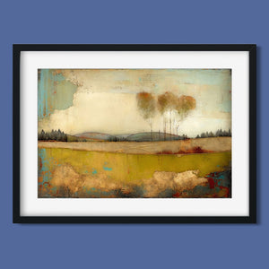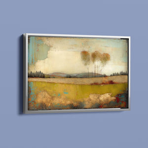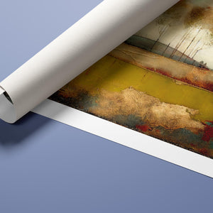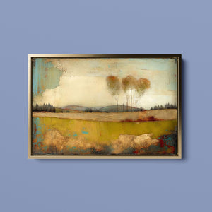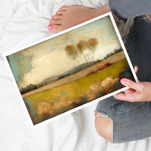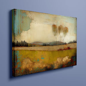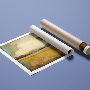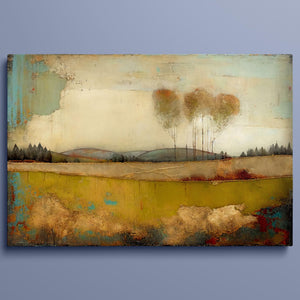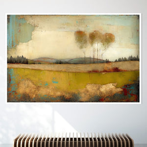 "Autumn Gold" is a striking abstract landscape painting that captures the warm essence of fall through earthy tones and muted colors. This artwork features serene hills and trees against a soft sky, evoking a sense of nostalgia and tranquility. The vintage texture and minimalist style add depth and contemplation, making it a perfect fit for any nature lover's space. Ideal for those who appreciate the beauty of seasonal change, this piece brings the golden hues of autumn into your home.