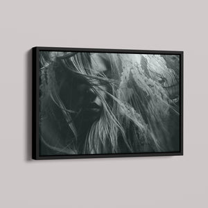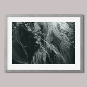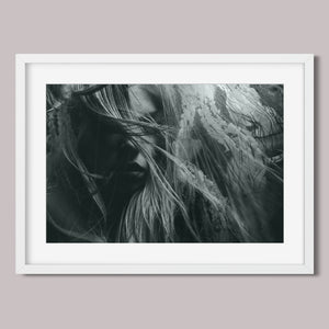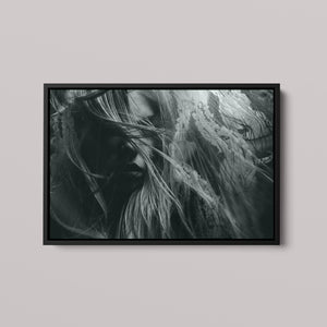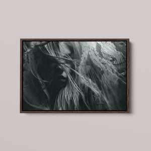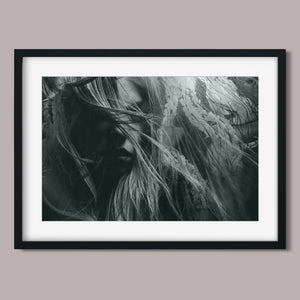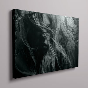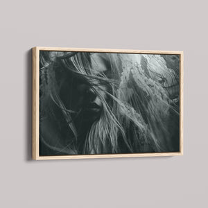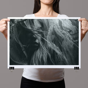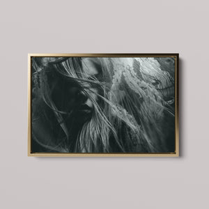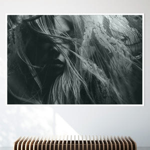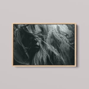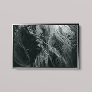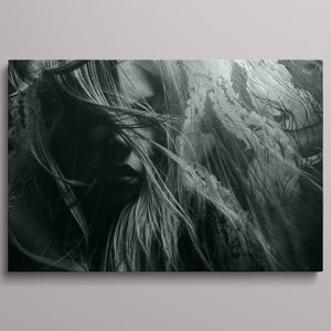 This striking black-and-white portrait captures the moody elegance of a "Bad Hair Day," blending fashion and fantasy in a blurred yet intense close-up. The mysterious woman, with her hair falling over her face, evokes a sense of obscured vision and emotion. The dramatic lighting and monochrome tones create depth and texture, highlighting the raw beauty of the subject. With its ethereal mood and intense gaze, this art piece showcases the interplay of shadow, expression, and natural beauty, making it a captivating addition to any collection.