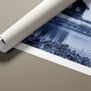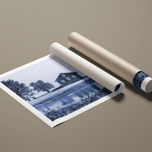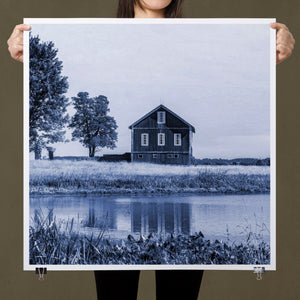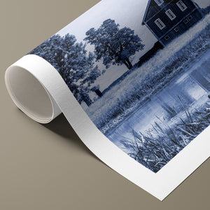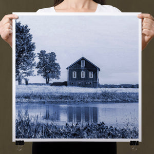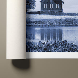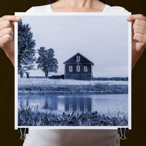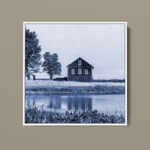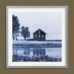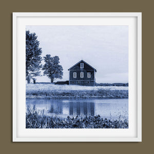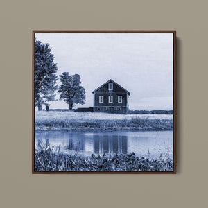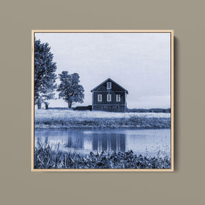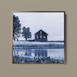 Artwork of a barn and tree beside water in tranquil blue tones, reflecting in the calm waters with a serene countryside landscape and peaceful ambiance.