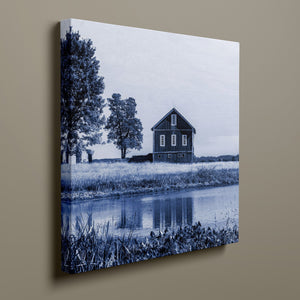 This tranquil artwork features a barn beside a tree, rendered in soothing blue tones, reflecting in the calm waters of Beach City, Ohio. The serene landscape captures the essence of rural solitude with its peaceful blue palette, clear skies, and gentle water reflections. The simplicity of the wooden structure and the surrounding grassland emphasize the beauty of nature and the calm of countryside life, making it a serene addition to any decor.