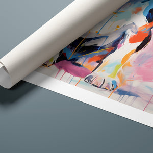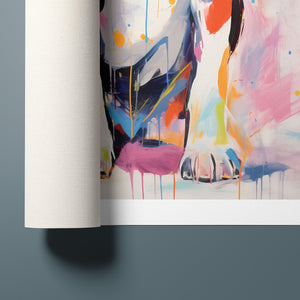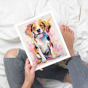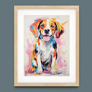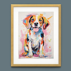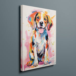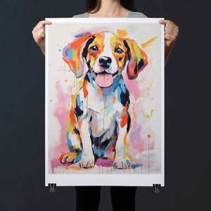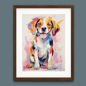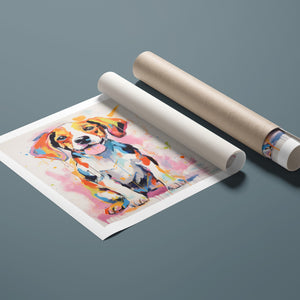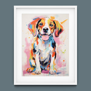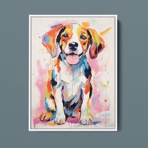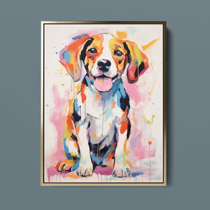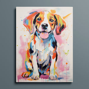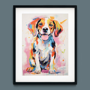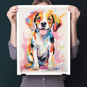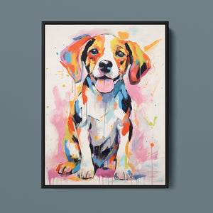 Beagle Delight presents a bold and colorful portrait of a beagle puppy, characterized by vibrant hues and joyful splashes of paint. The artwork reflects the puppy's cheerful personality with energetic brushstrokes and an abstract style. Featuring a warm color palette and whimsical details, this piece celebrates the playful and optimistic nature of the beagle.