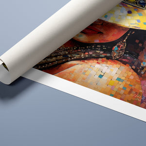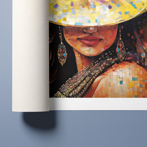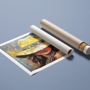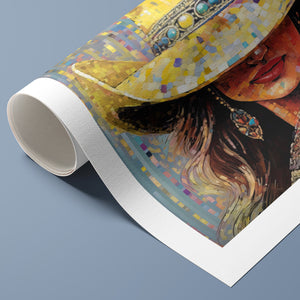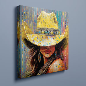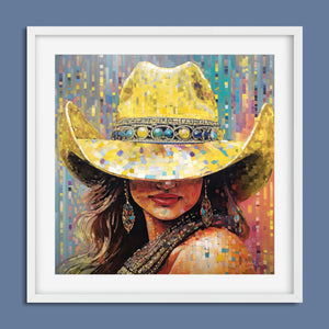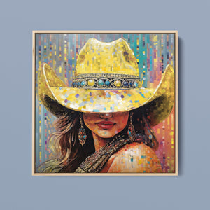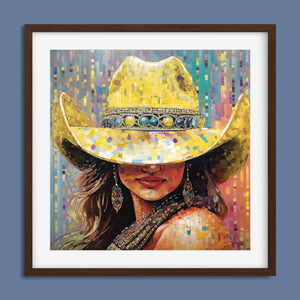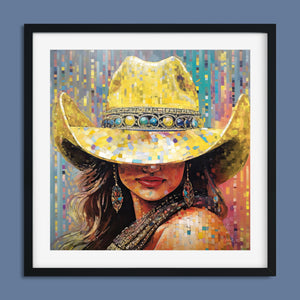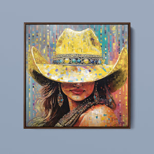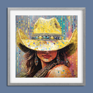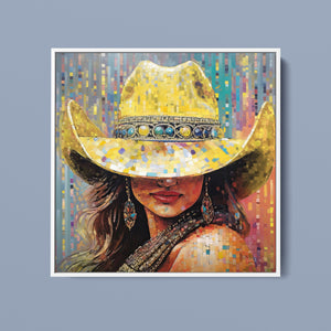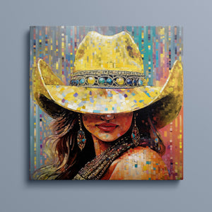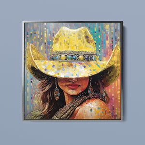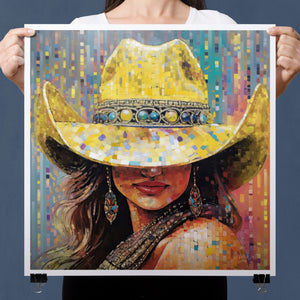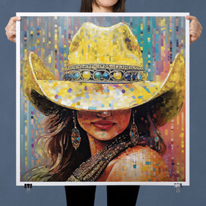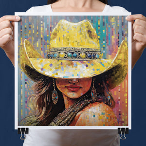 "Behind The Brim - Yellow" captures the mystique of cowgirl fashion with a pop art flair. Featuring a bold, rhinestone-studded hat that partially obscures the face, this vibrant portrait exudes western charm and feminine strength. The sparkling details and colorful patterns evoke the excitement of a hoedown or rodeo, making this artwork a celebration of country style and the lively spirit of the American West.