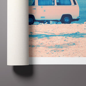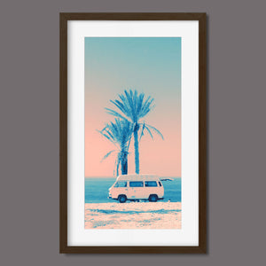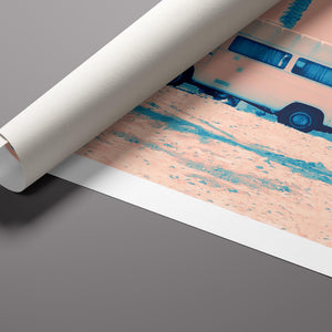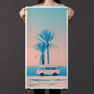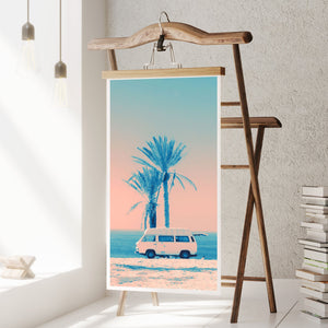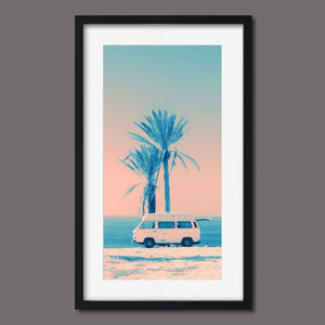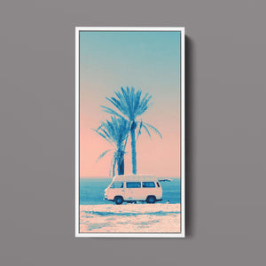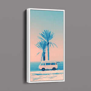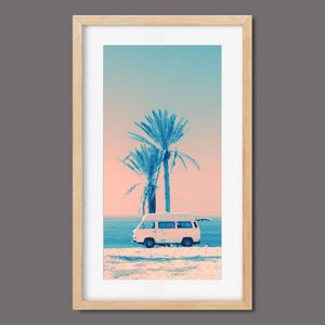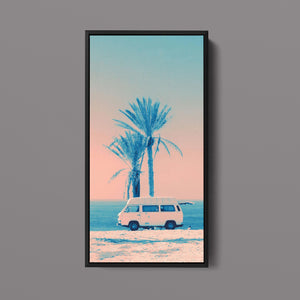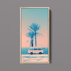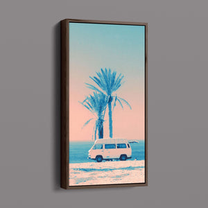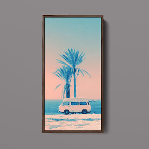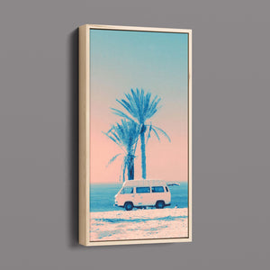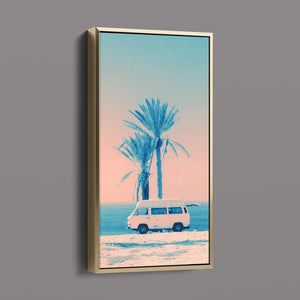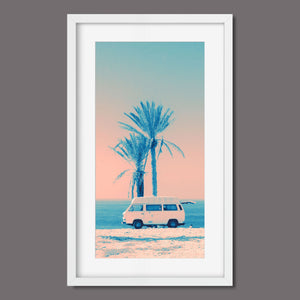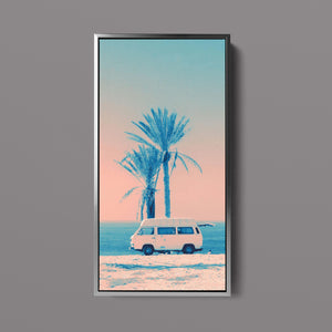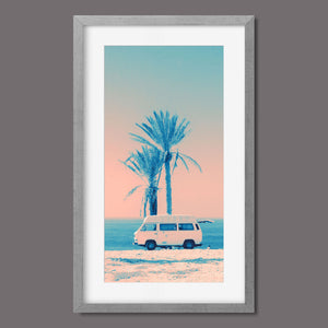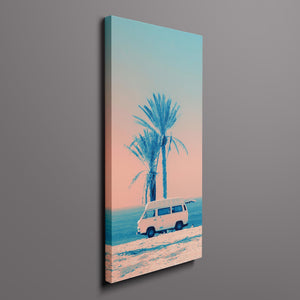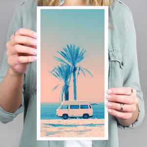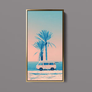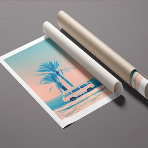 "Blue Coral Palms" is a captivating tropical artwork that transports you to a serene beach paradise. Featuring a vintage camper nestled along a sandy shore, this piece beautifully captures the essence of leisure and adventure. The tranquil turquoise ocean, framed by graceful palm trees, invites you to escape into a world of sun-drenched relaxation and wanderlust. The pastel hues of blue and rose gold create a dreamy atmosphere, making this artwork the perfect addition to any space yearning for a touch of coastal elegance and summer vibes.