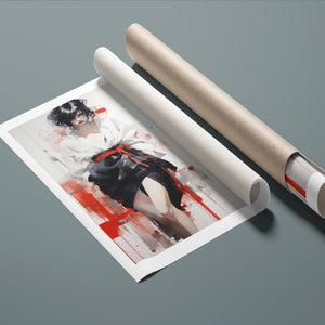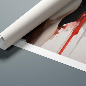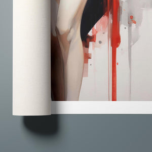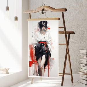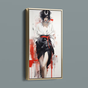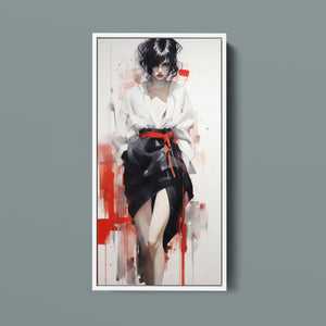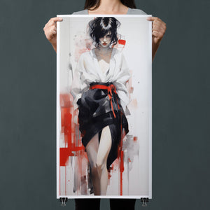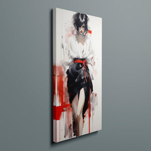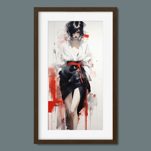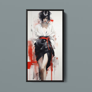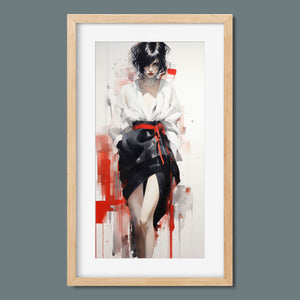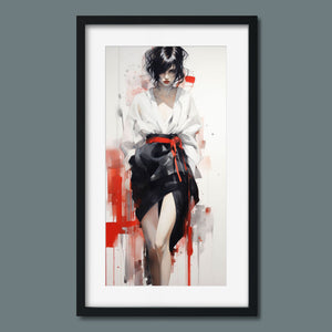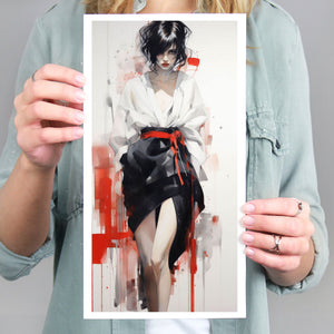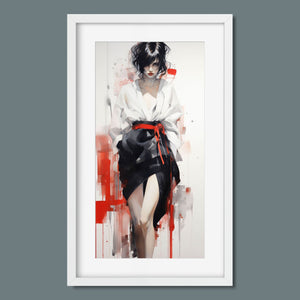 This striking fashion figure art piece blends elements of modern style with traditional cultural elegance. The abstract depiction of a woman in a red and black kimono-style outfit evokes the sophistication of Japanese fashion, while the dynamic brush strokes and splatter effects add an expressive, contemporary twist. The white blouse offers a sensual contrast to the bold color palette, creating a look that's both elegant and intriguing. With its fusion of tradition and modernity, this artwork is a captivating tribute to fashion's enduring influence on art.