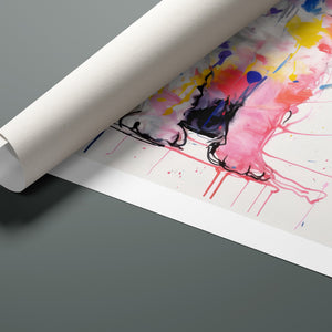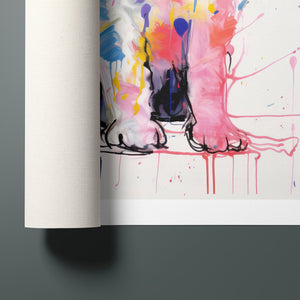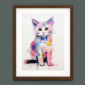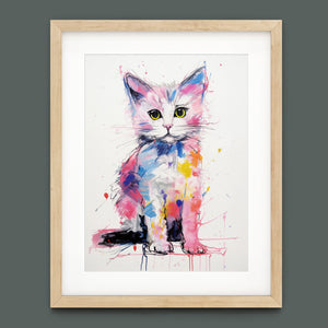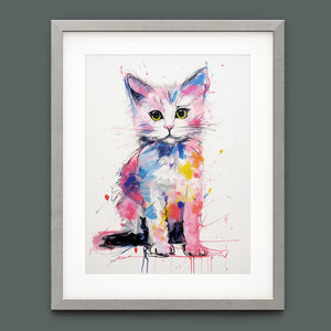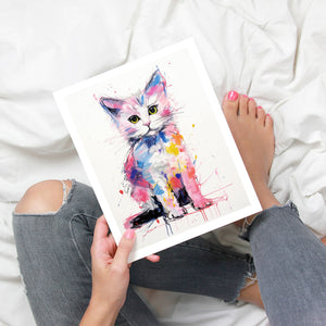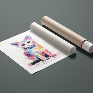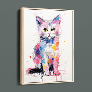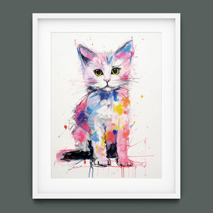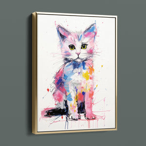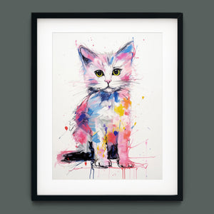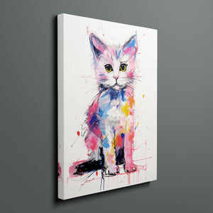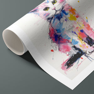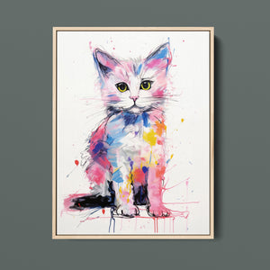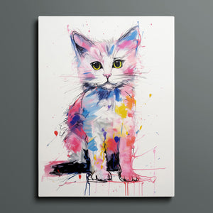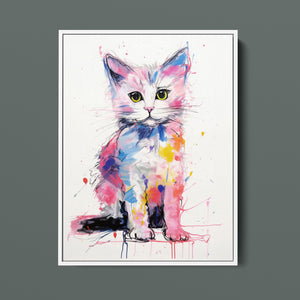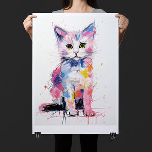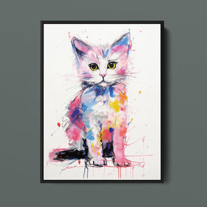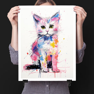Brighten up your home with the Bold Colorful Happy Cat, a contemporary artwork showcasing a playful and vibrant feline. This whimsical portrait, featuring abstract splatters and expressive strokes in pink, blue, and yellow, brings energy and joy to any room. Ideal for those who appreciate modern art, creativity, and the cheerful spirit of our feline friends.