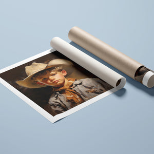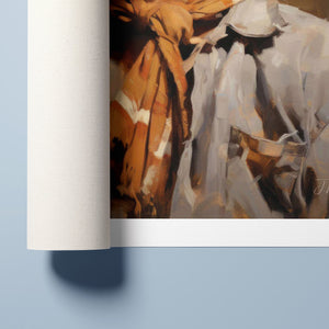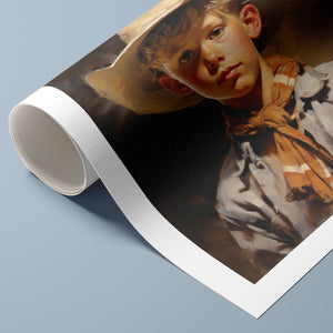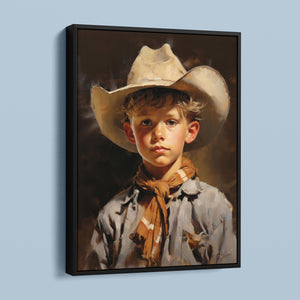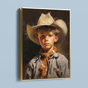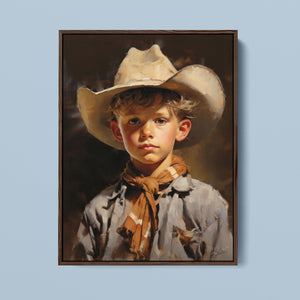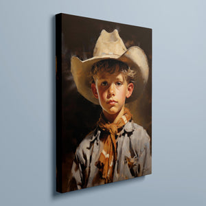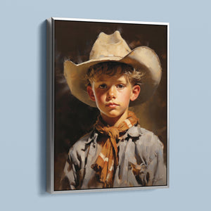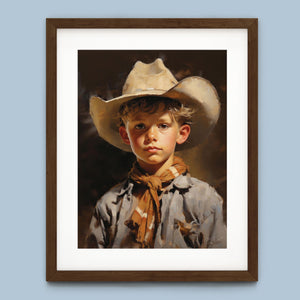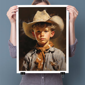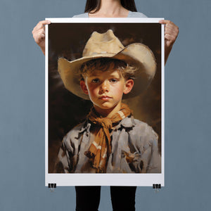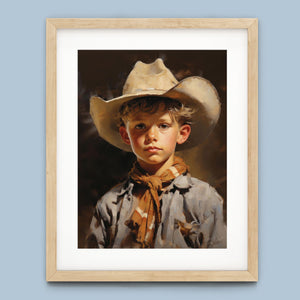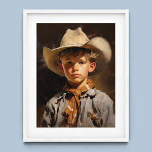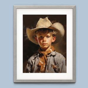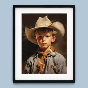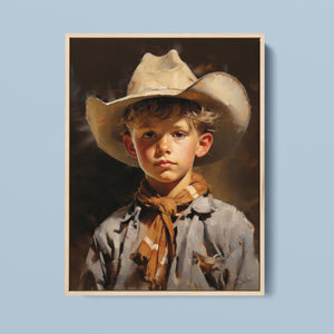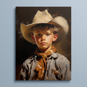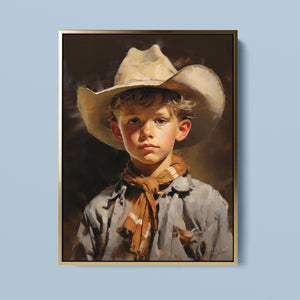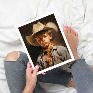 "Born to Ride" portrays a young boy dressed in vintage cowboy fashion, reflecting the rugged charm and innocence of Western life. This oil painting is a nostalgic tribute to childhood and cowboy culture, making it an ideal piece for fans of classic Americana.