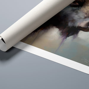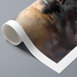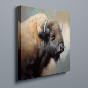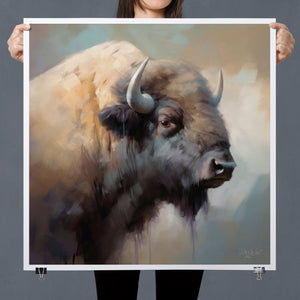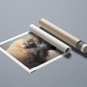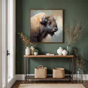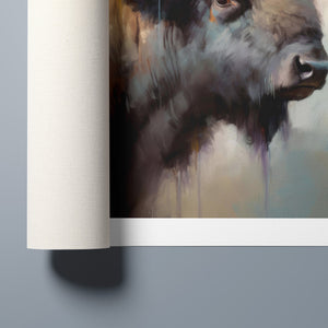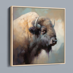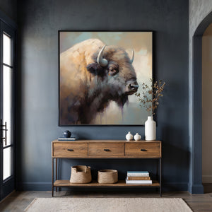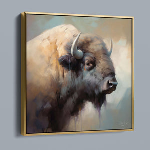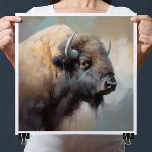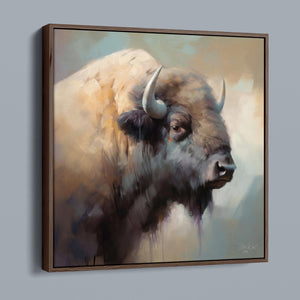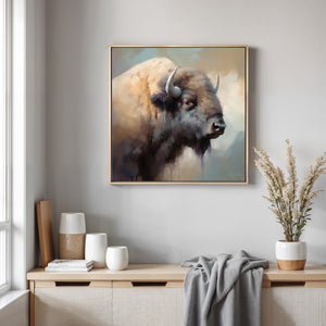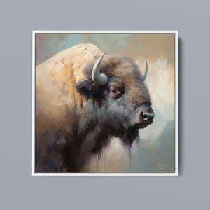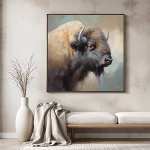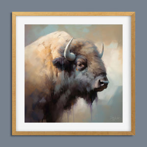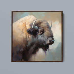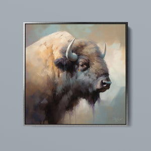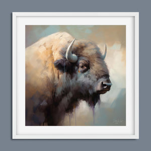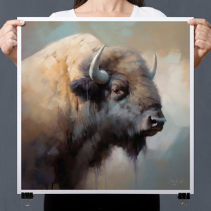 "Breath of a Buffalo" captures the majestic presence of a horned bison roaming the wild with a modern, watercolor approach. Featuring subtle pastel colors and a depiction of the Rocky Mountain countryside, this artwork portrays the powerful animal as it grazes across the prairie. The gentle hues and fluid brushstrokes evoke the serene beauty of nature, celebrating the rugged elegance of one of North America's iconic big game species.