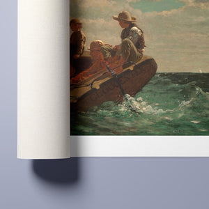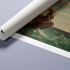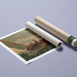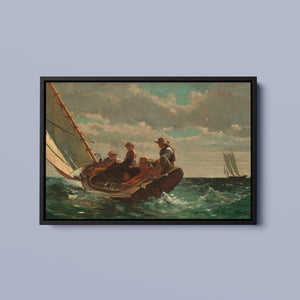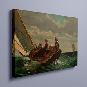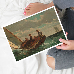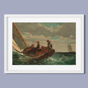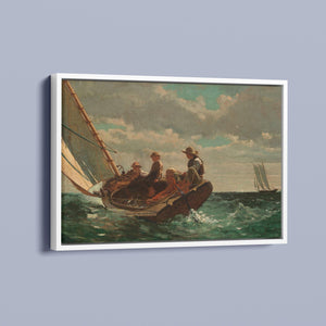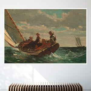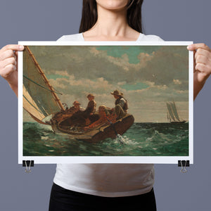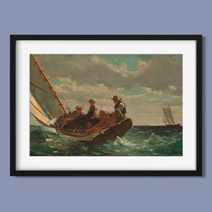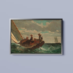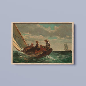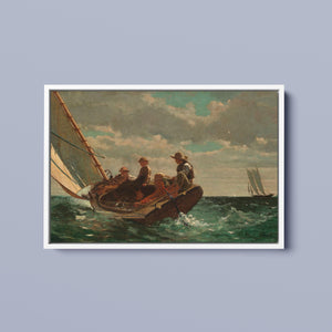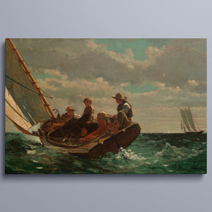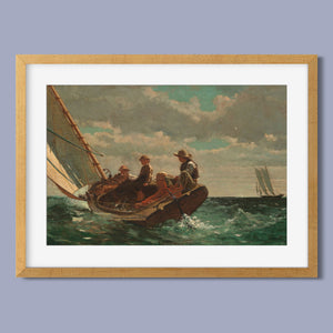 "Breezing Up - A Fair Wind" by Winslow Homer captures the dynamic essence of maritime leisure in the 19th century. This horizontal seascape depicts a sailing vessel navigating the ocean with the wind in its favor, surrounded by the vast blue sky and churning waves. Homer’s use of navy, white, and brown tones, along with his depiction of sunlight and movement, evokes the tranquility and excitement of traditional nautical recreation. The painting beautifully conveys the serenity of nature and the timeless appeal of sailing.