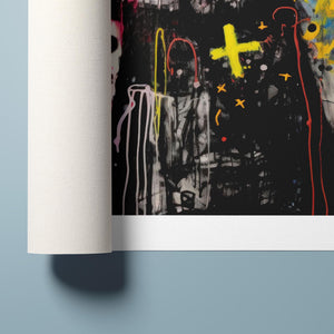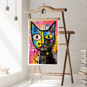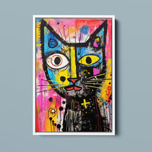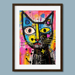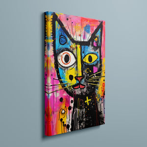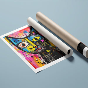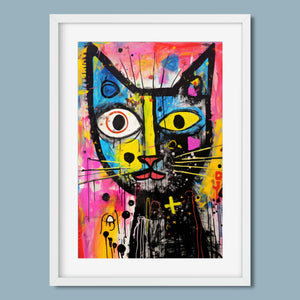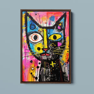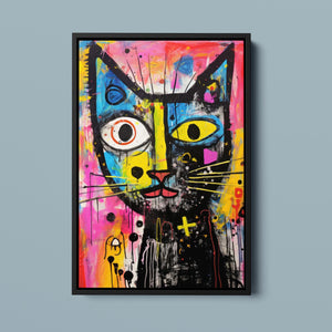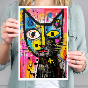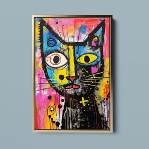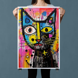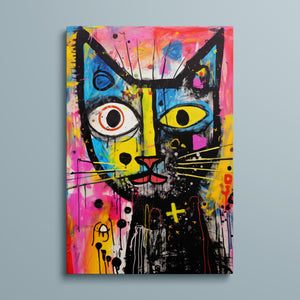 "Brut Cat Crazy" bursts with energy and imagination, showcasing a vibrant, abstract feline portrait. This piece merges contemporary graffiti and street art styles with a whimsical, surreal twist. The bold, multicolored strokes and splatters create a dynamic and expressive depiction of a cat's face, full of wild contrast and artistic flair. The use of acrylic paint and energetic brushwork adds depth and texture, capturing the essence of urban artistry in a playful and visually striking manner.