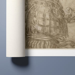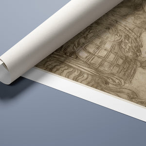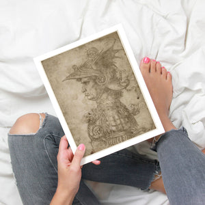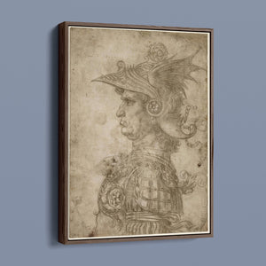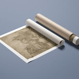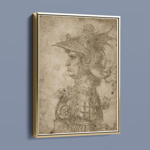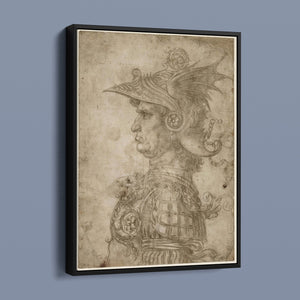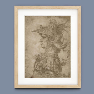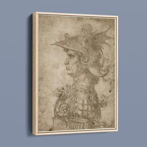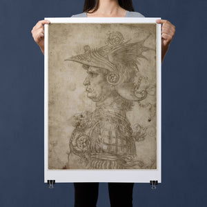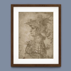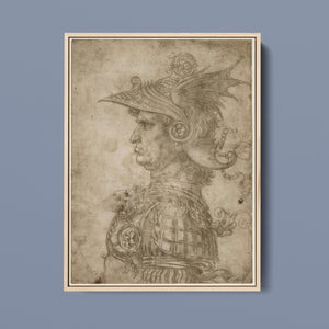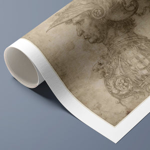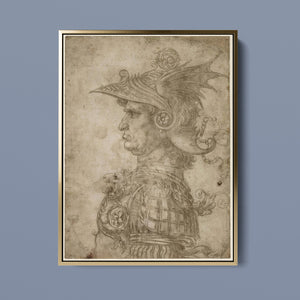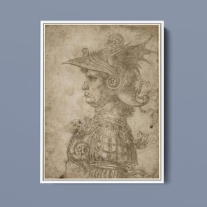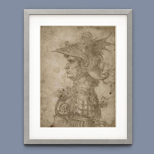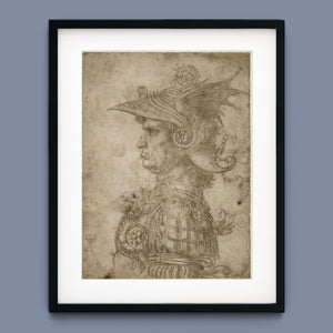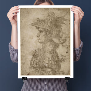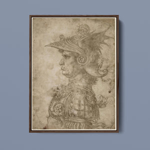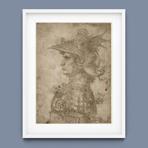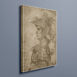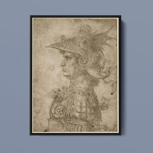 Explore the meticulous craftsmanship of Leonardo da Vinci's Bust of a Warrior in Profile, a silverpoint drawing from the Renaissance era. This classic artwork highlights the intricate details of the warrior's helmet and armor, capturing the elegance and historical significance of the period. Rendered on parchment, the sketch reflects da Vinci's masterful skill in metalwork and his ability to convey depth and expression through delicate lines.