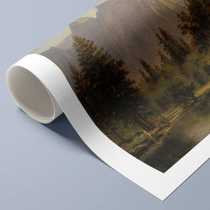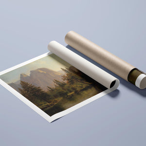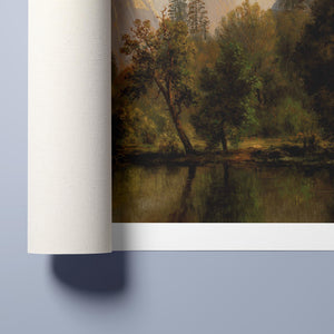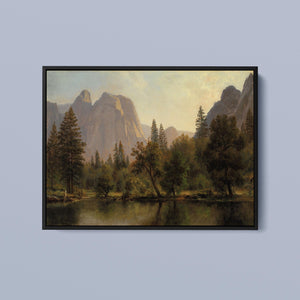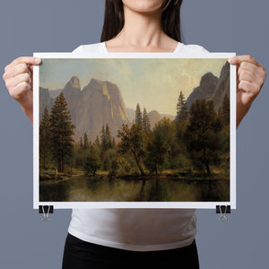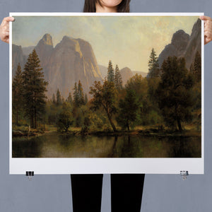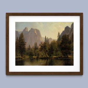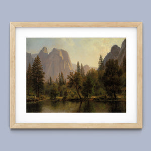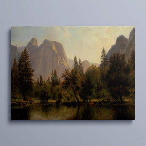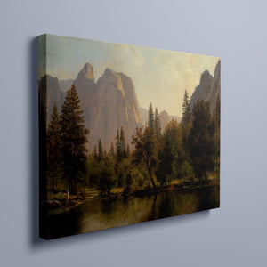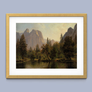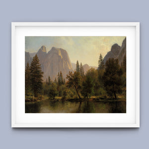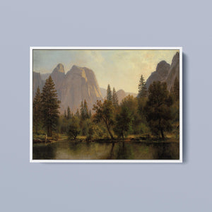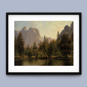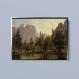 Discover Cathedral Rocks, Yosemite Valley 1872 by Albert Bierstadt, a stunning 19th-century landscape painting that showcases the serene beauty of the American West. The artwork captures the majestic mountains, verdant forests, and tranquil water reflections in Yosemite Valley, rendered in golden light and realistic detail.