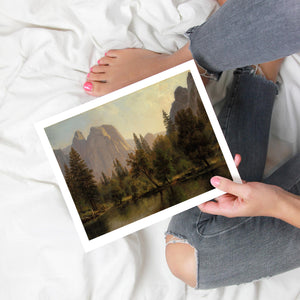 19th-century landscape painting by Albert Bierstadt, Cathedral Rocks in Yosemite Valley, depicting serene mountains, lush forests, and golden light reflections.