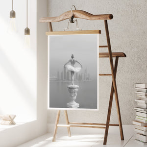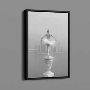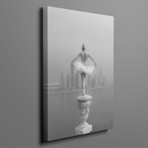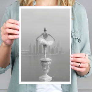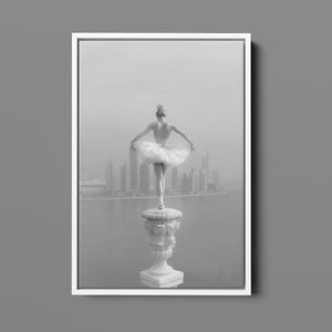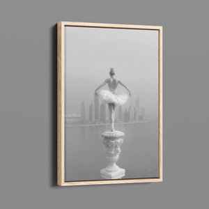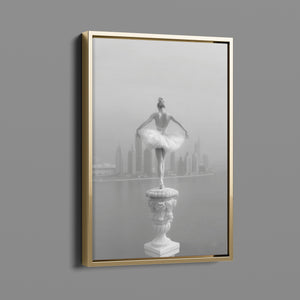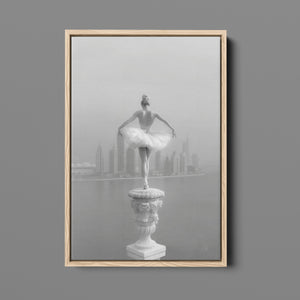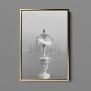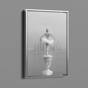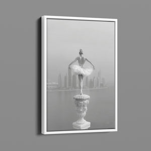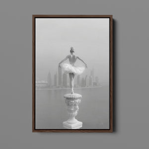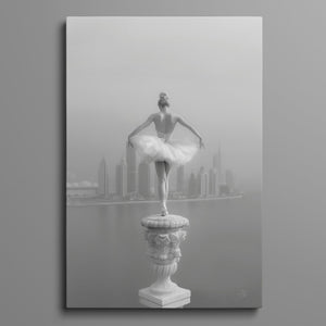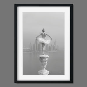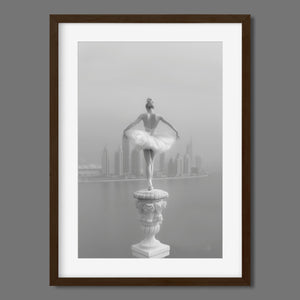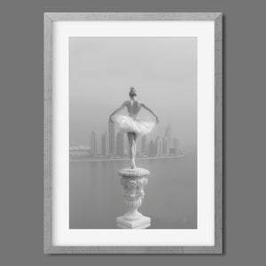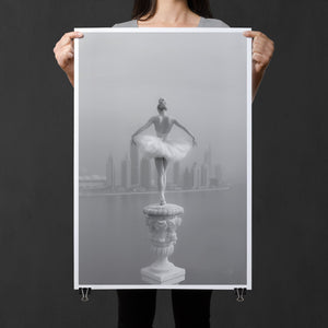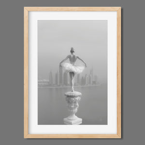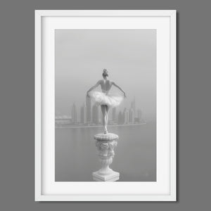 This captivating image from the Vertige - En Pointe collection showcases a luminous ballerina striking an hourglass pose atop a towering spire overlooking Dubai's awe-inspiring skyline. The dancer's graceful silhouette is juxtaposed against the backdrop of the Dubai Water Canal, a 3.2-kilometer waterway that winds through the heart of the city, connecting the historic Dubai Creek to the Arabian Gulf. Completed in 2016, this man-made marvel has transformed Dubai's urban landscape, offering a stunning contrast between the flowing waters and the city's futuristic architecture. The photograph captures the juxtaposition of human artistry with architectural grandeur, as the ballerina's pose echoes the upward reach of iconic structures like the Burj Khalifa, the world's tallest building at 2,723 feet.
