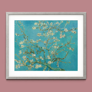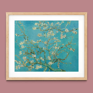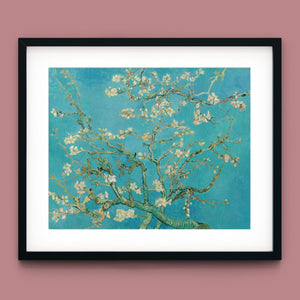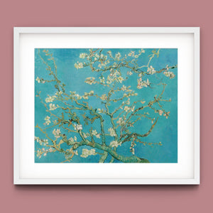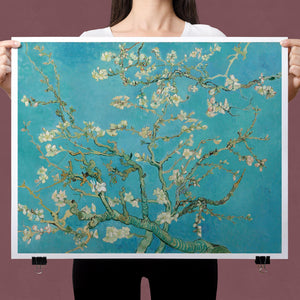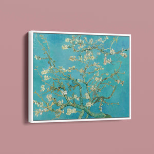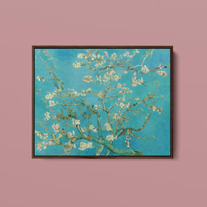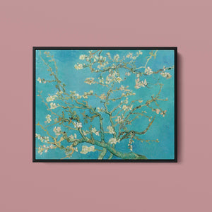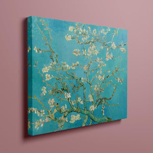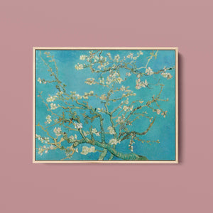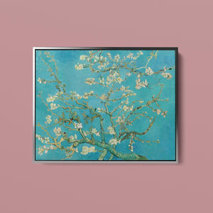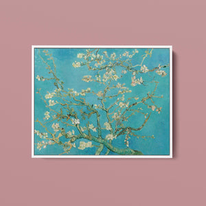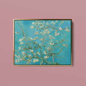 A beutiful horizontal painting that transports you to a serene springtime scene, where the vibrant hues of cherry blossoms capture the essence of nature's beauty. This post-impressionist artwork blends the classic charm of European botanical subjects with Van Gogh’s distinct, textured brushwork. Delicate almond tree branches, adorned with soft pink and white blossoms, are set against a backdrop of soothing blues and earthy greens. The painting's tranquil atmosphere and vibrant colors reflect the pastoral elegance and blooming vitality of spring. The lively brush strokes and rich texture evoke a sense of serenity and natural beauty, showcasing Van Gogh's unique interpretation of floral splendor.