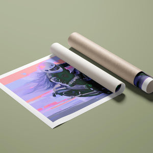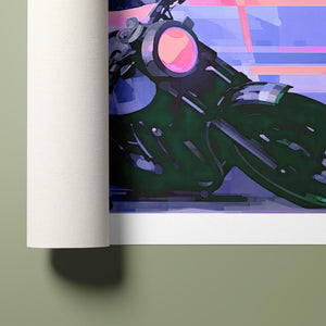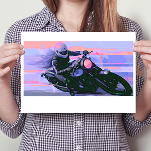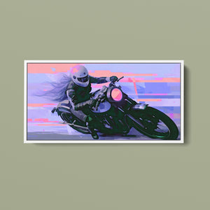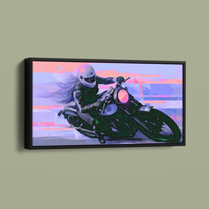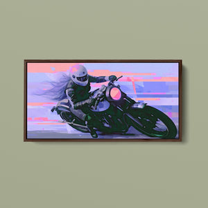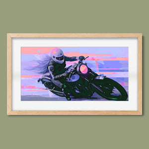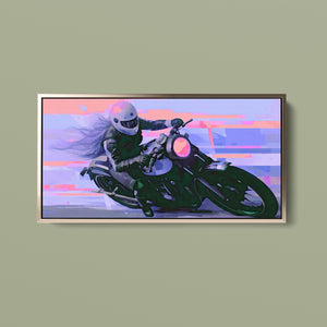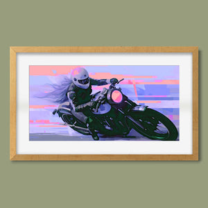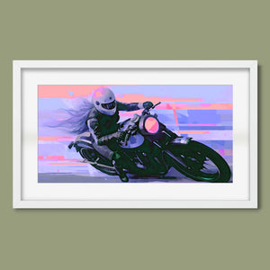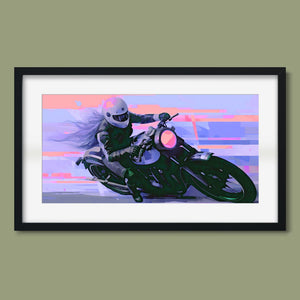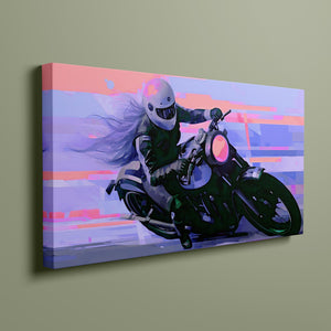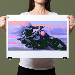 "Chicks Love Bikes - Red" is a vibrant and dynamic illustration celebrating the thrilling intersection of femininity and motorcycle culture. This artwork captures a stylish woman donning rose gold and pink hues, fully immersed in her passion for bikes while listening to music through colorful earphones. The playful splashes of color and modern watercolor drips evoke a sense of freedom and adventure, making it a perfect addition for those who appreciate contemporary art that embraces hobbies and leisure activities. It's a tribute to the bold spirit of women in the world of motorcycles.