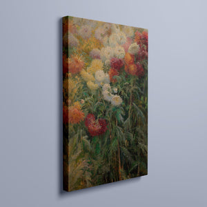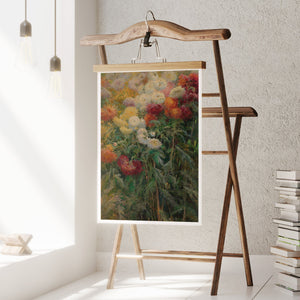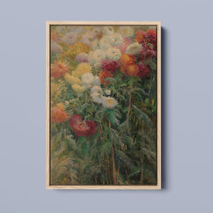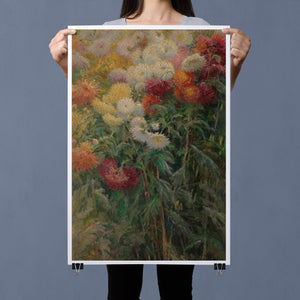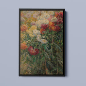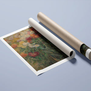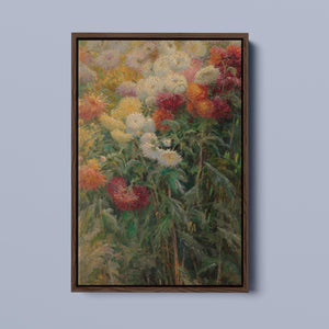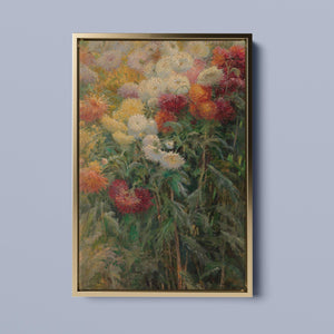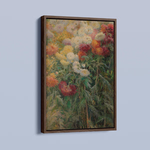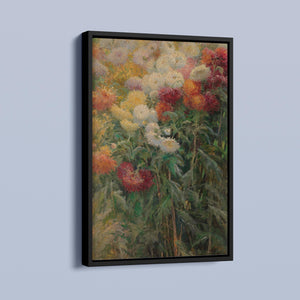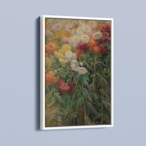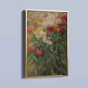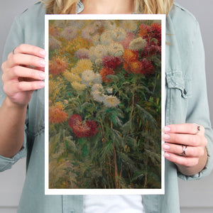 "Chrysanthemums in the Garden at Petit-Gennevilliers" captures the vibrant beauty of blooming chrysanthemums in a lush 19th-century European garden. This vertical impressionistic painting showcases a rich tapestry of red, rose gold, and white flowers amid green foliage. The artist’s use of dynamic brush strokes and pastel tones conveys a sense of serenity and the rich texture of the autumn garden. The painting reflects both the horticultural charm and the artistic essence of the period, offering a glimpse into the peaceful leisure of outdoor beauty and botanical richness.