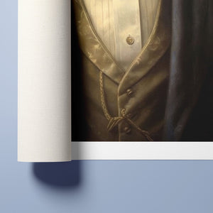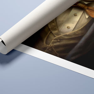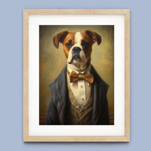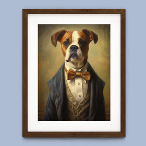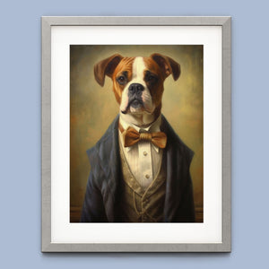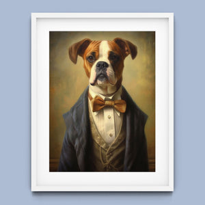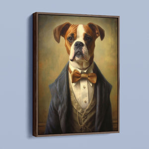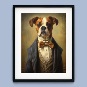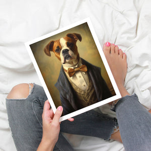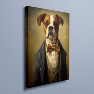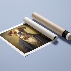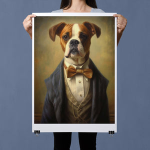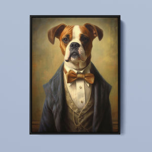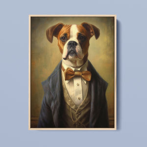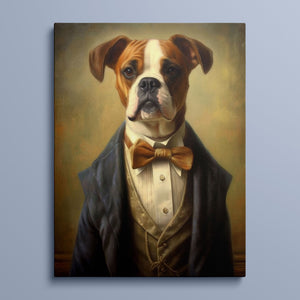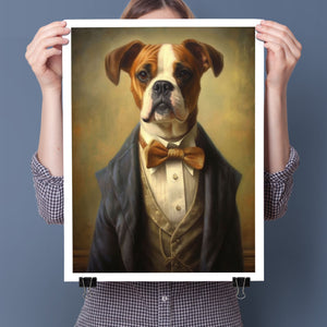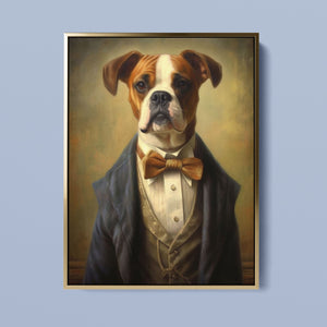 Classic Canine Pawtrait Boxer presents a refined boxer breed dressed in a suit and bowtie. The vintage-style portrait highlights the dog’s dignified and sophisticated demeanor with a serious expression and intelligent gaze. The oil painting effect and warm tones emphasize the regal, elegant nature of this whimsical artwork, perfect for adding a touch of charm and sophistication to any space.