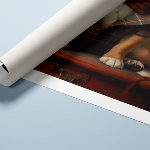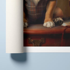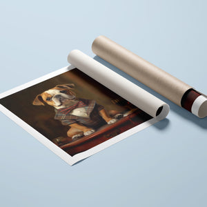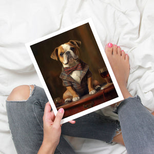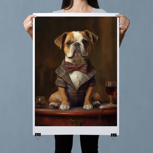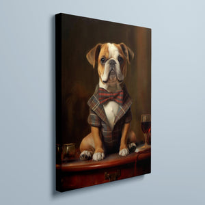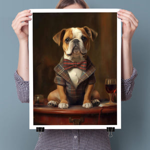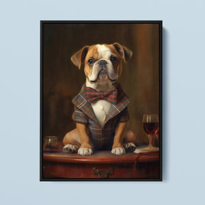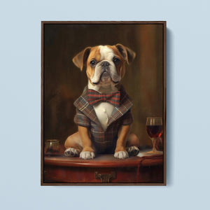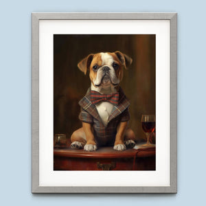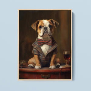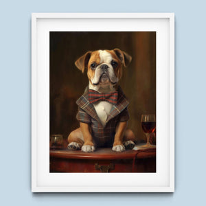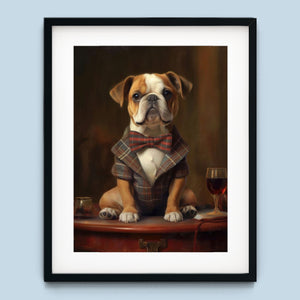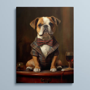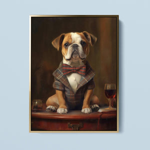 Classic Canine Pawtrait - Buggsie features a refined bulldog dressed in a stylish tie and blazer, seated with a wineglass on a table. This vintage-inspired portrait captures the dog's charming and dignified demeanor, with warm tones and a realistic, aristocratic flair. The artwork exudes sophistication and whimsy, perfect for those who appreciate classic and fashionable pet portraits.