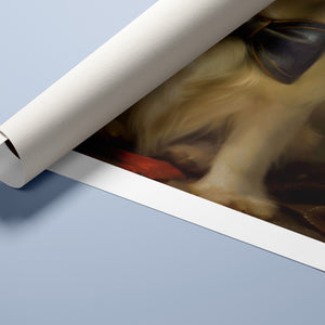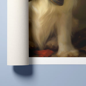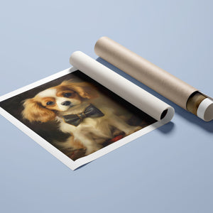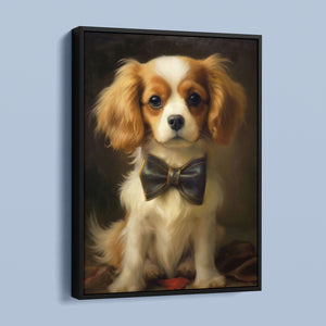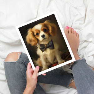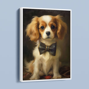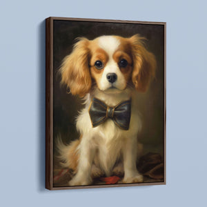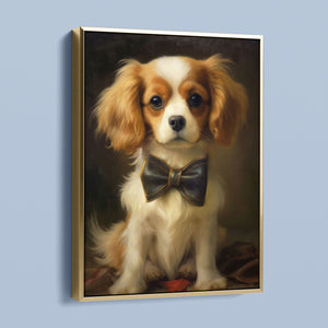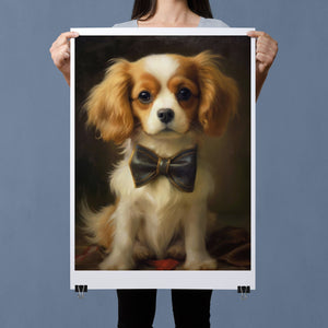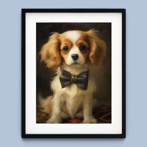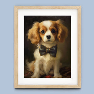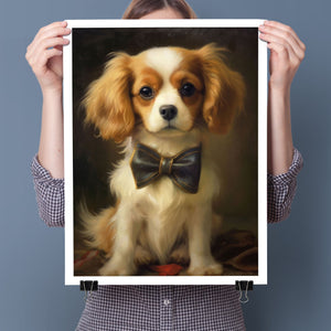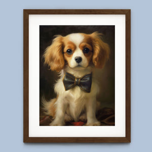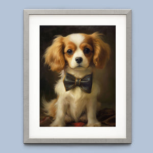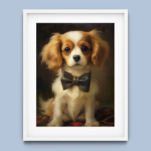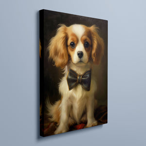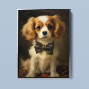 Classic Canine Pawtrait Charlie presents a Cavalier Spaniel dressed elegantly in a bowtie. This nostalgic portrait captures the dog's gentle and regal demeanor with soft fur and expressive eyes. The warm, vintage tones and artistic touch make it a sentimental and charming piece for dog lovers.