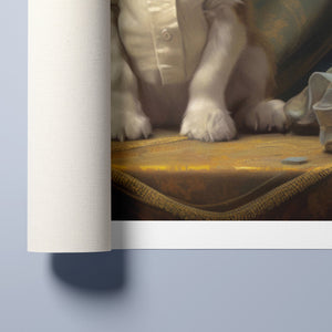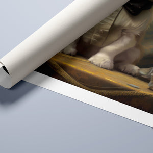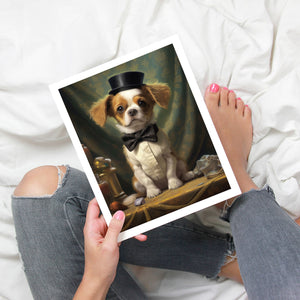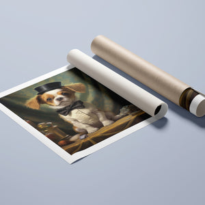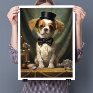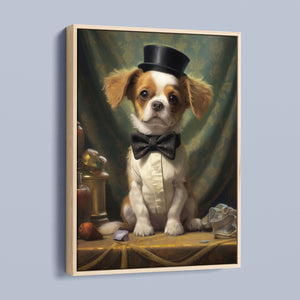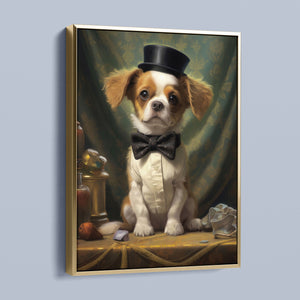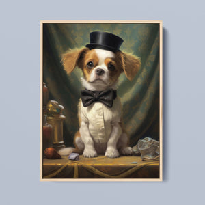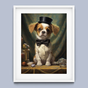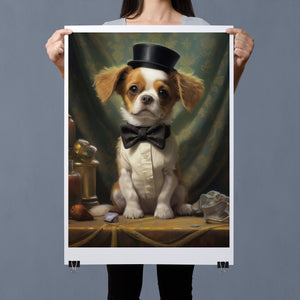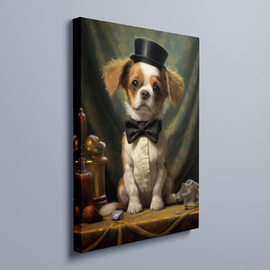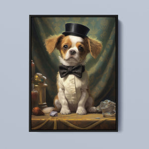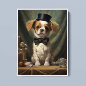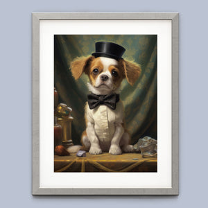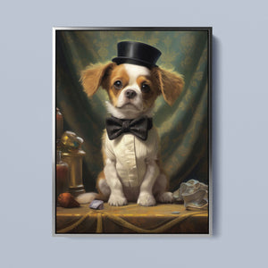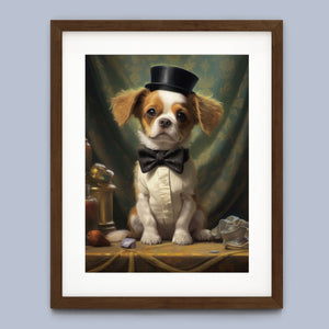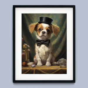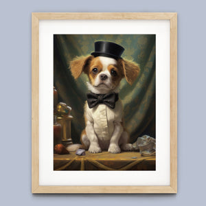 lassic Canine Pawtrait - Jack is an elegant depiction of a sophisticated dog in formal attire. This vintage-inspired portrait features a charming puppy dressed in a top hat and bowtie, seated with a dignified expression. The artwork captures a warm, aristocratic aura with its antique style and photorealism, making it a perfect piece for dog lovers and art enthusiasts alike.