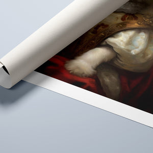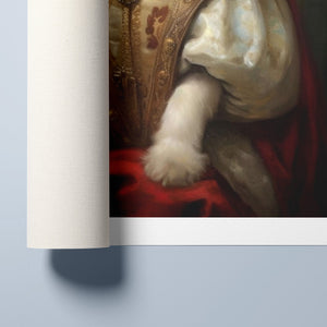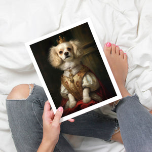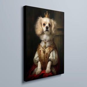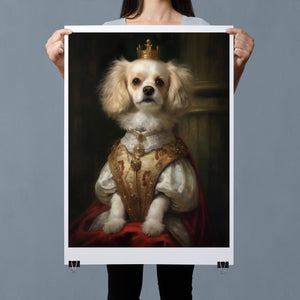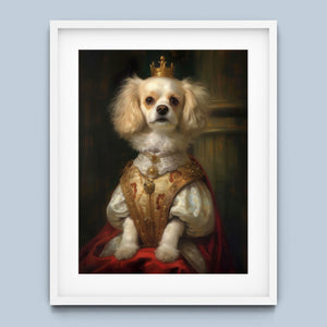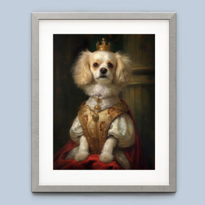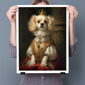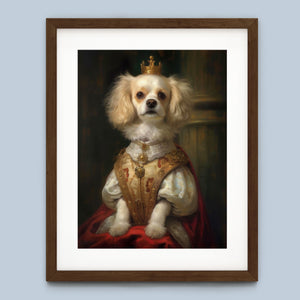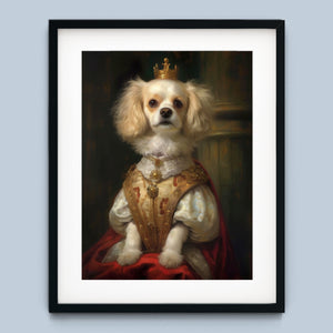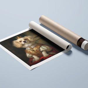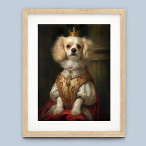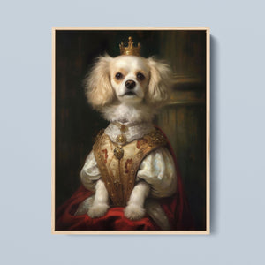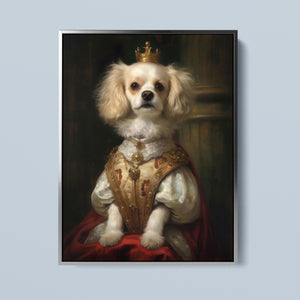 Classic Canine Pawtrait - King Charles presents a majestic Cavalier Spaniel in regal attire. This vintage-style portrait features the dog crowned and seated on a throne, draped in a velvet robe with gold accents. The opulent and dignified artwork reflects aristocratic charm, capturing the elegance and nobility of the breed in an antique, sophisticated manner. Ideal for those who appreciate classic and whimsical pet portraits.