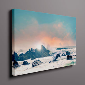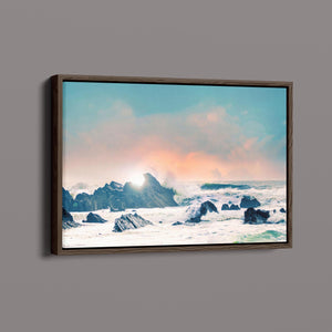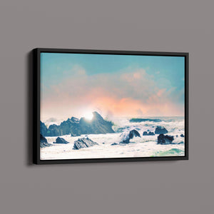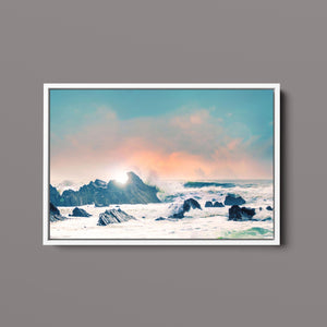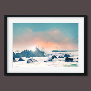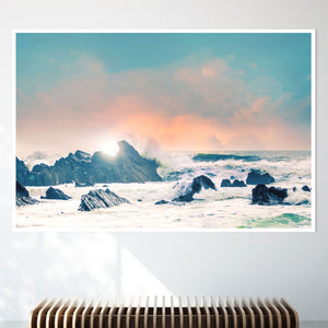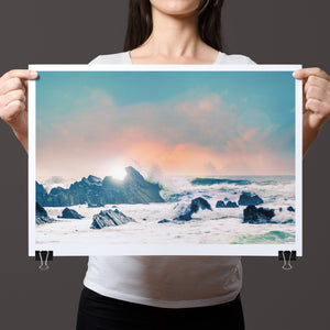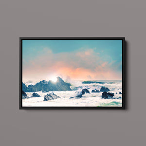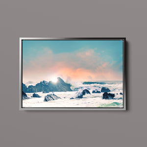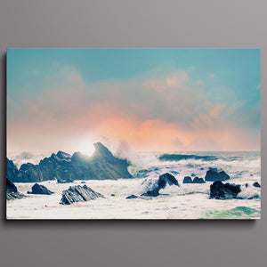 "Coast Nature Photography" is a stunning seascape that captures the rugged beauty of the ocean at sunrise. This artwork features dynamic waves crashing against cliffs, with sunlight shimmering across the surface, creating a mesmerizing interplay of teal and turquoise hues. Ideal for nature lovers and those who appreciate coastal tranquility, this piece invites the serene essence of the seaside into any living space.