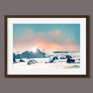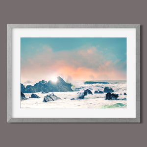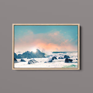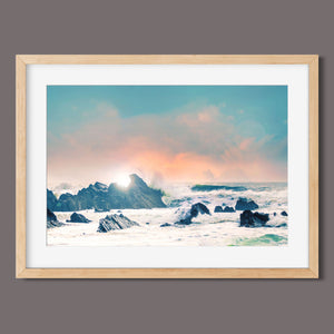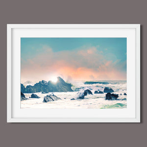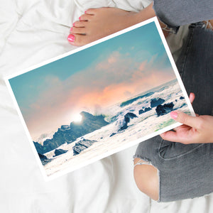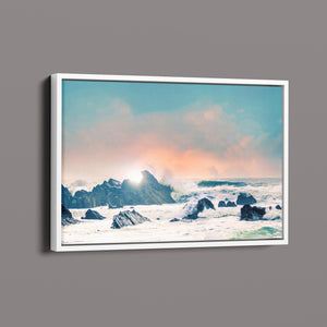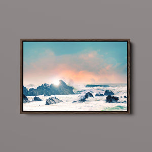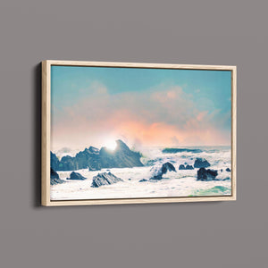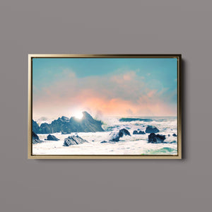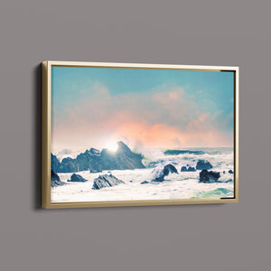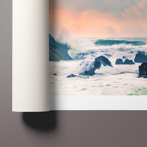 Seascape artwork featuring waves crashing against rugged cliffs at sunrise, showcasing a tranquil coastal scene with dynamic textures in blue, rose gold, and black.