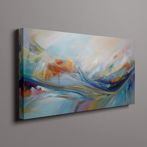 Contemporary abstract painting featuring vibrant swirls of blue, turquoise, and coral, capturing the dynamic essence of ocean life and evoking a serene, calming atmosphere.
