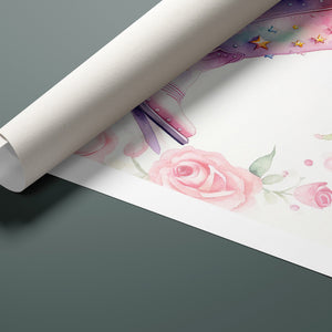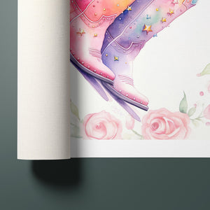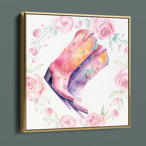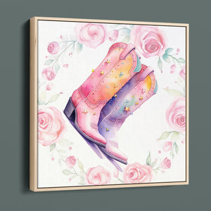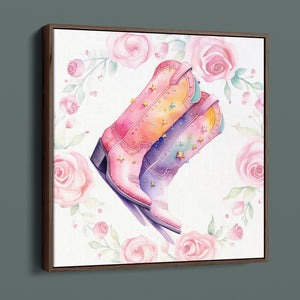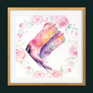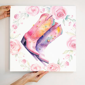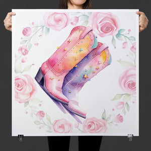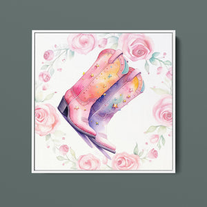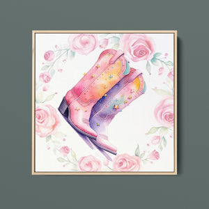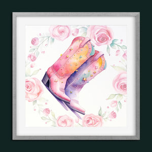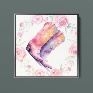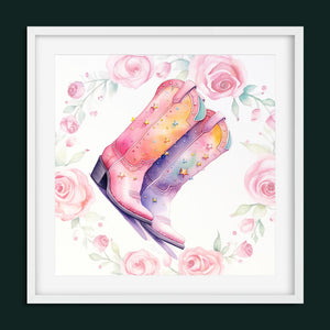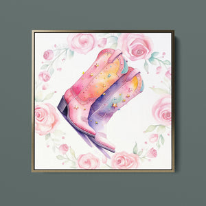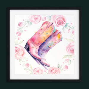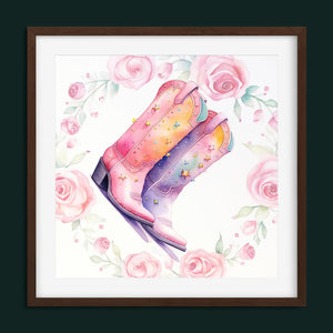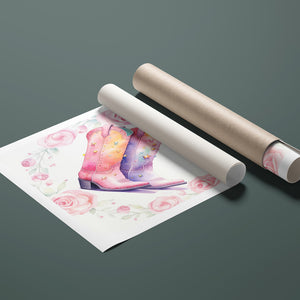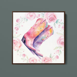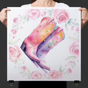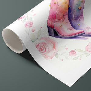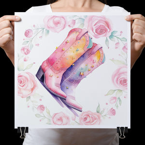 This charming watercolor illustration blends the rugged beauty of cowgirl boots with the delicate elegance of pastel pink floral accents. The boots, adorned in a whimsical floral wreath, evoke a playful yet feminine touch, perfect for celebrating western style with a soft, botanical flair. Ideal as a decorative accent for little girls or anyone who loves blending country charm with a touch of Barbie-inspired fashion.