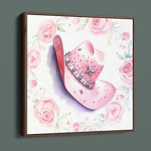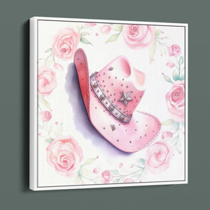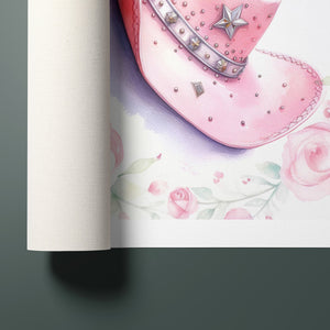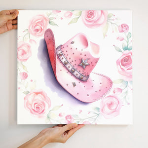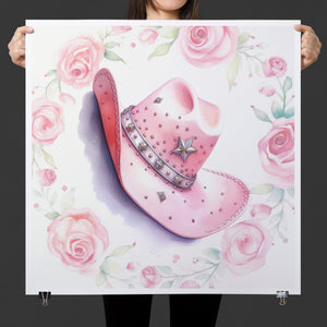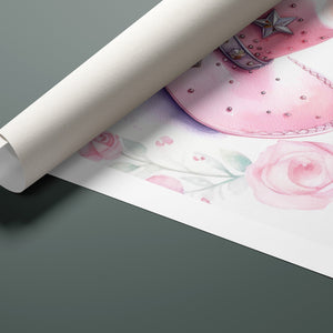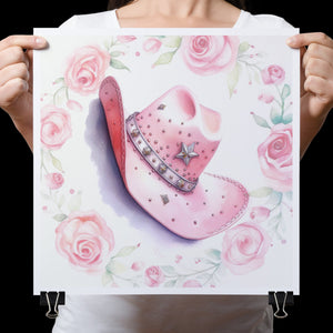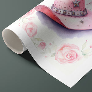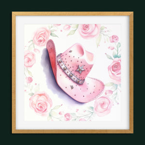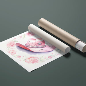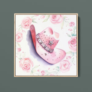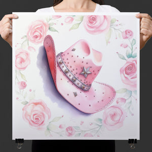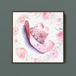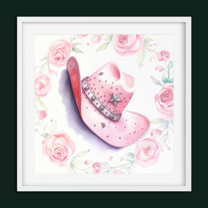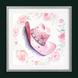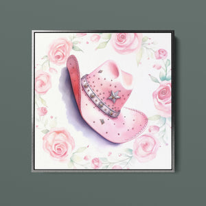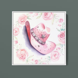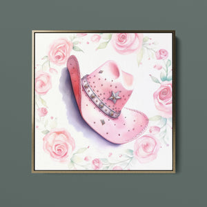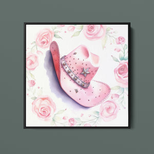 "Cowgirl Diamond Decor - Hat" features a whimsical cowboy hat adorned with a delicate pastel pink floral wreath. The soft watercolor hues and intricate botanical details blend western charm with feminine elegance, creating a playful yet sophisticated piece. Perfect as a gift or decorative accent, this illustration adds a touch of floral beauty to the classic cowgirl hat, ideal for little girls or anyone who loves a gentle western touch.