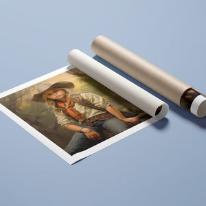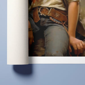 "Cowgirl in Training" depicts a delightful young blonde girl in vintage Western fashion. This oil painting showcases the rustic charm and youthful spirit of a budding cowgirl, celebrating the classic American West style with elegance and beauty.