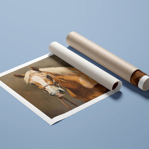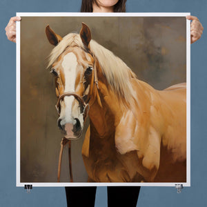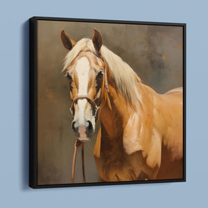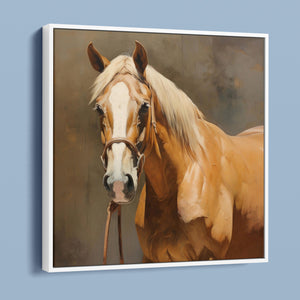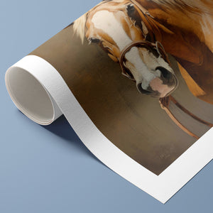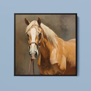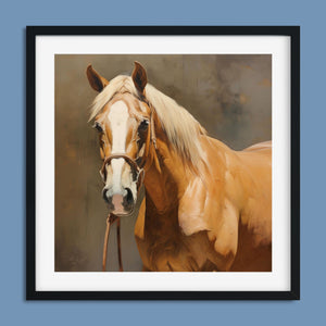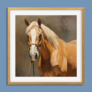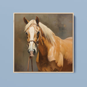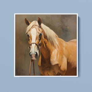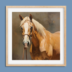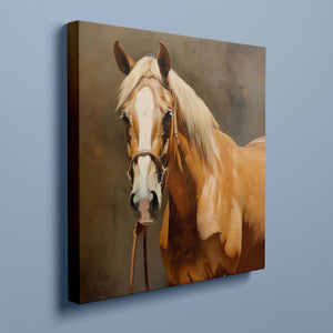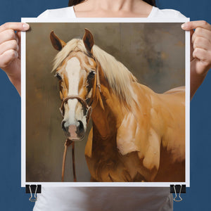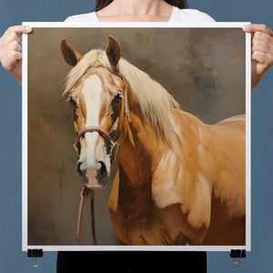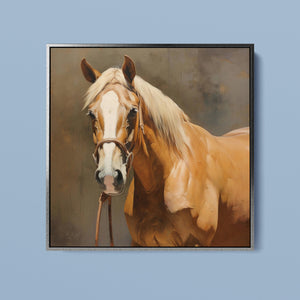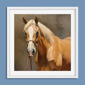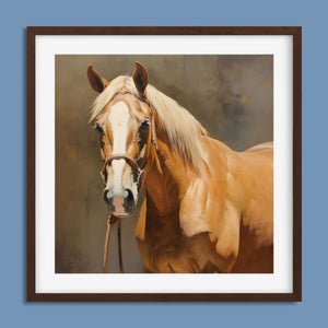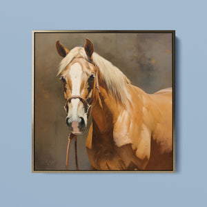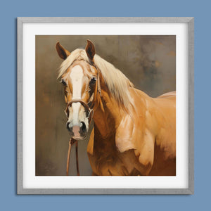 "Cowgirl's Companion" is an evocative oil painting showcasing a caramel-colored horse with a light face and mane. This portrait beautifully captures the bond between the horse and its environment, reflecting the elegance and vitality of equine life. With its vintage western charm, this artwork celebrates the deep connection between the cowgirl and her steadfast companion, embodying the spirit of American rural and western traditions.