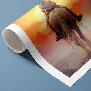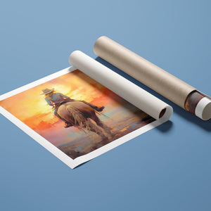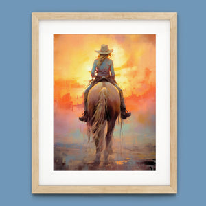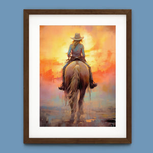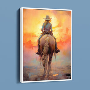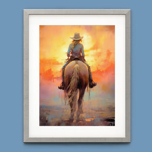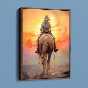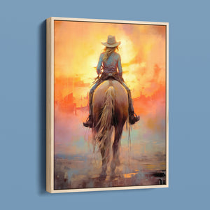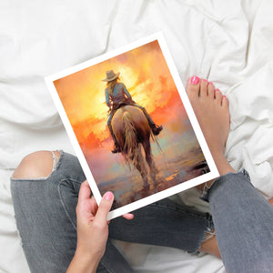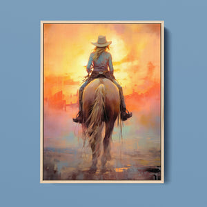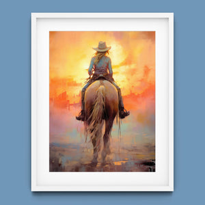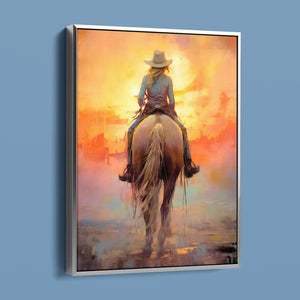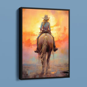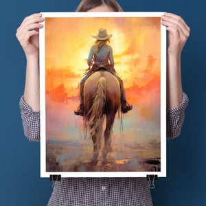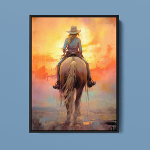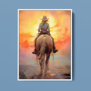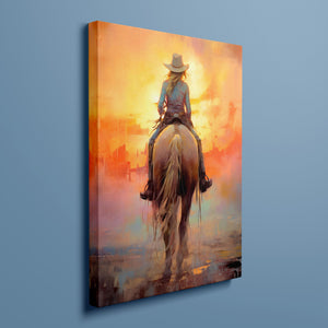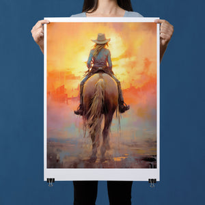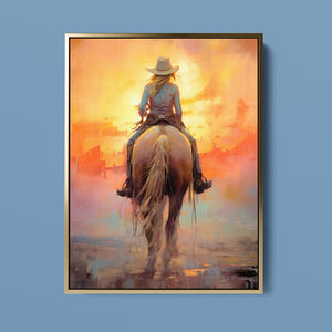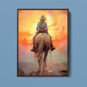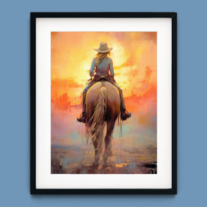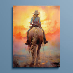 Dawn to Dusk - Cowgirl Riding into a Bold Colorful Sunset