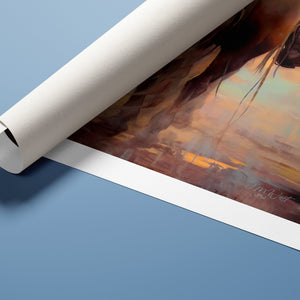 "Dawn to Dusk" illustrates a cowgirl riding her horse into a striking, colorful sunset. This painting captures the essence of the Southwestern landscape, emphasizing the bold hues of the sunset and the dynamic motion of the rider in the Arizona and New Mexico deserts.