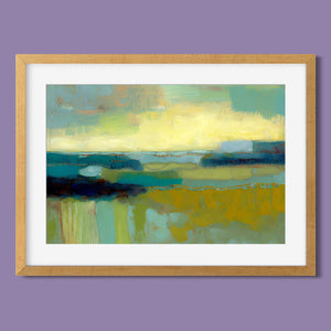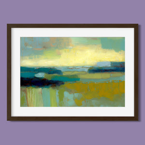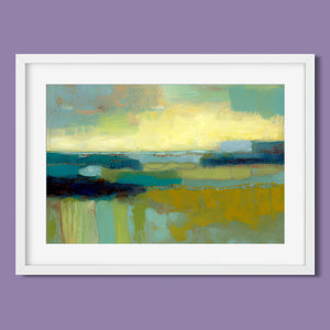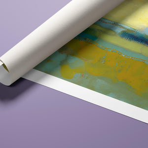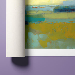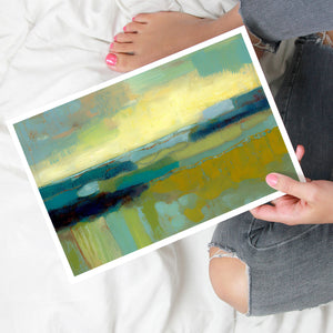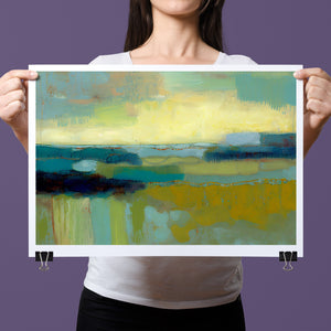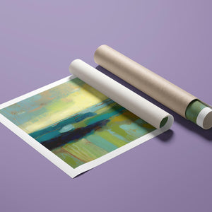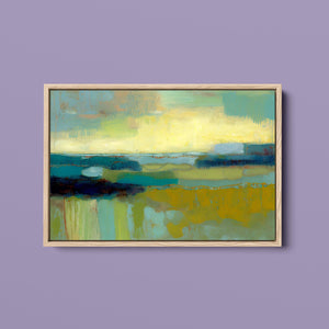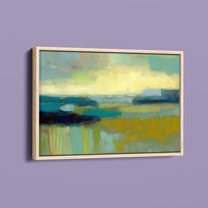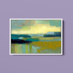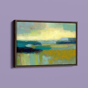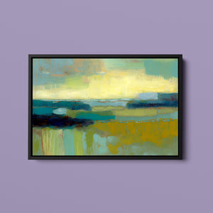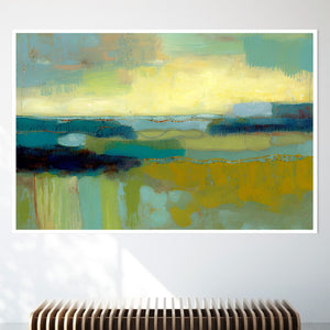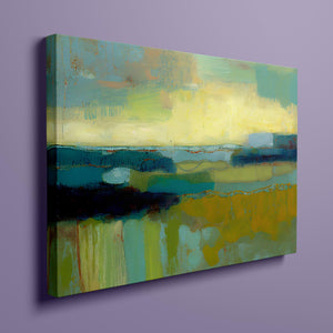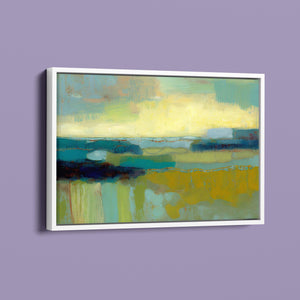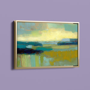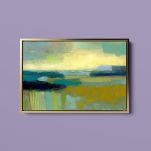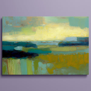 "DayBreak Lake" is a captivating abstract landscape that beautifully depicts the gentle serenity of dawn over a peaceful waterfront. The artwork features a harmonious blend of yellow, green, and blue, creating a vibrant and soothing atmosphere. With its soft brushstrokes and ethereal quality, this piece invites you to experience the calm of morning light, making it an ideal choice for those seeking a refreshing addition to their space.