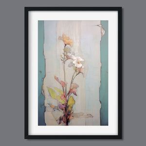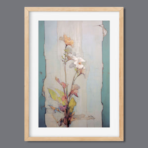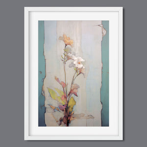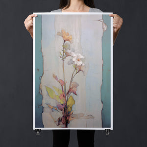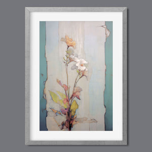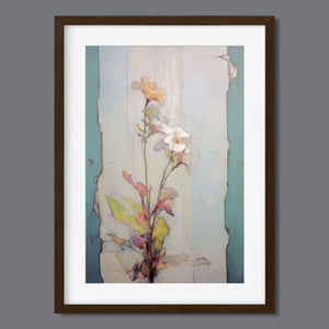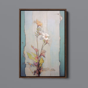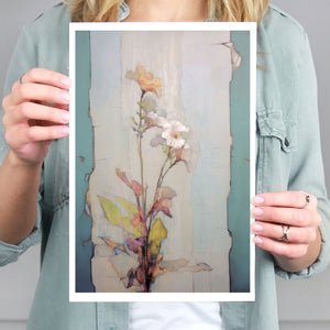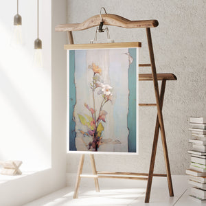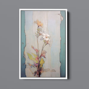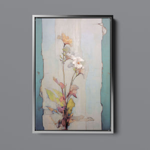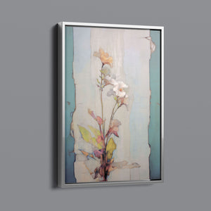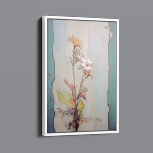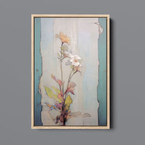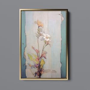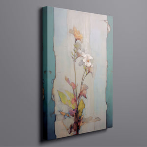"Delicate Wallflower - Fresco Floral" is a serene, pastel-toned painting that captures the essence of a fragile bloom. With soft beige, blue, and rose gold hues, this artwork exudes a sense of vintage romance and elegance. Its delicate petals and subtle earth tones evoke the beauty of nature in springtime, while the light, ethereal textures create an atmosphere of tranquility. Perfect for adding a touch of refined beauty and gentle charm to any space, this piece blends artistic sensitivity with a timeless, country French flair.