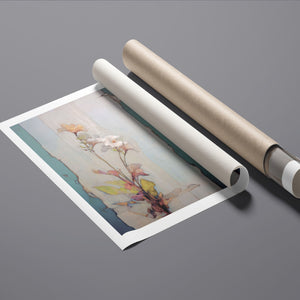 Delicate botanical painting in pastel tones, featuring fragile blooms in beige, blue, and rose gold, with a vintage, romantic feel.