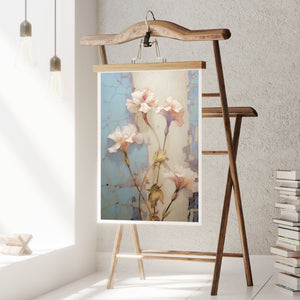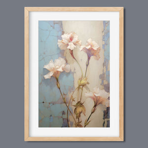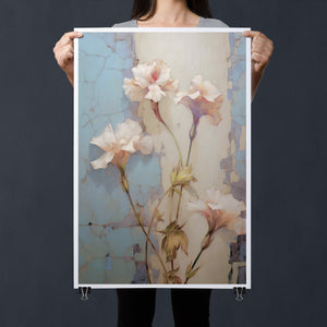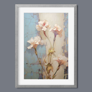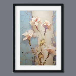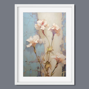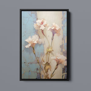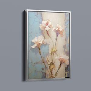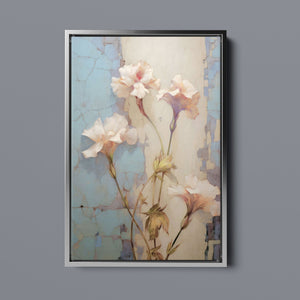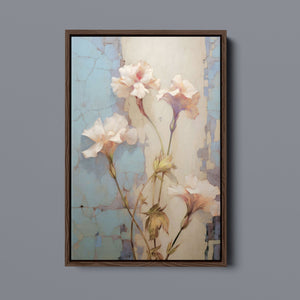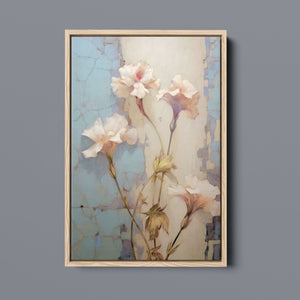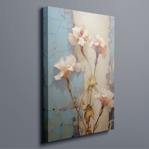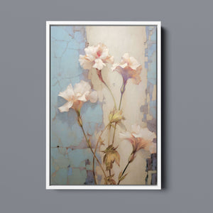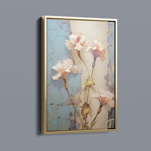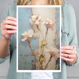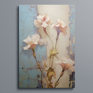 "Delicate Wallflower - Fresco Floral" is a serene, pastel-toned painting that captures the essence of a fragile bloom. With soft beige, blue, and rose gold hues, this artwork exudes a sense of vintage romance and elegance. Its delicate petals and subtle earth tones evoke the beauty of nature in springtime, while the light, ethereal textures create an atmosphere of tranquility. Perfect for adding a touch of refined beauty and gentle charm to any space, this piece blends artistic sensitivity with a timeless, country French flair.