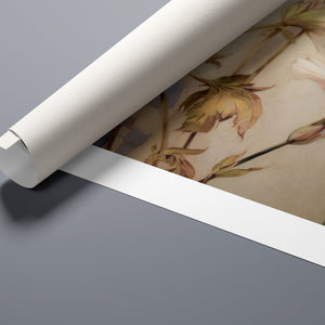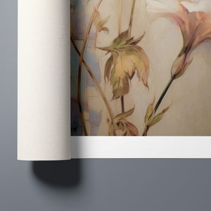 Delicate botanical painting in pastel tones, featuring fragile blooms in beige, blue, and rose gold, with a vintage, romantic feel.