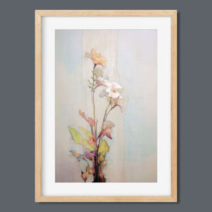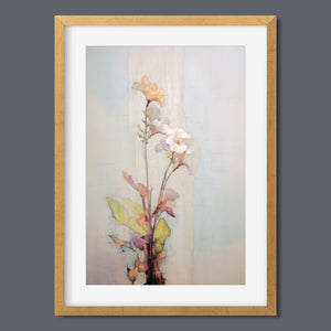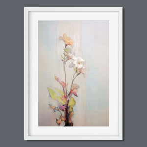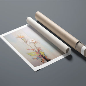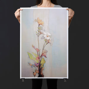 Delicate botanical painting in pastel tones, featuring fragile blooms in beige, blue, and rose gold, with a vintage, romantic feel.