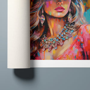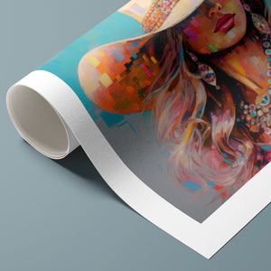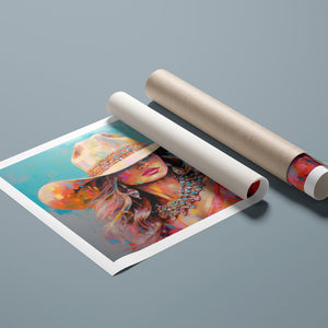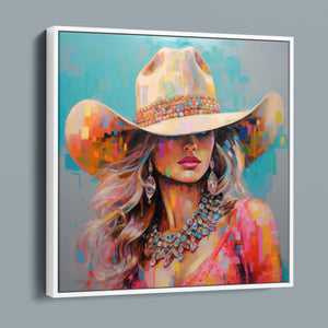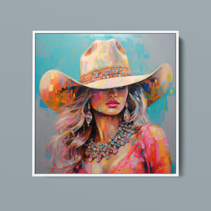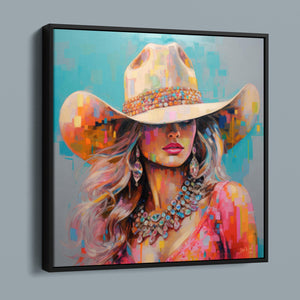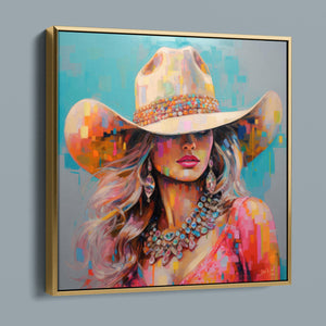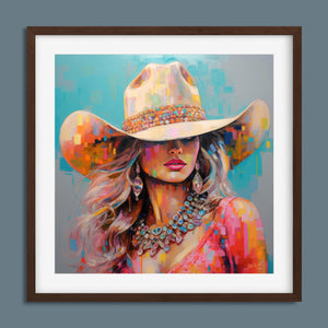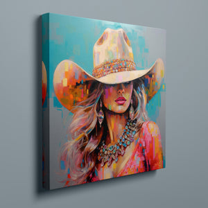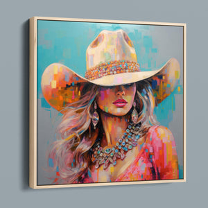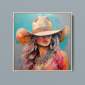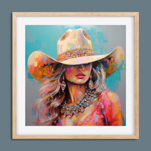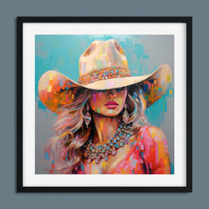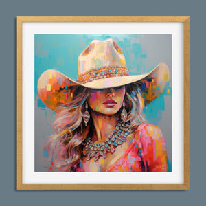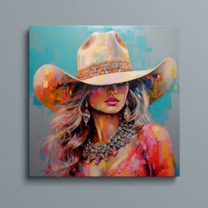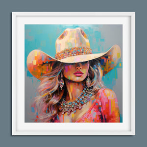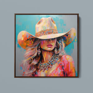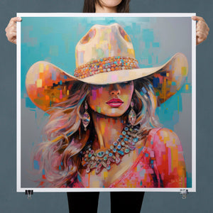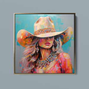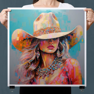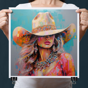 "Desert Beauty" showcases a striking oil painting of a cowgirl dressed in a bold red blouse and large hat, set against a desert-inspired backdrop. This artwork captures the essence of western fashion and rodeo culture, blending rustic charm with the elegance of a rodeo queen. The vibrant brush strokes highlight the cowgirl’s confident beauty and dynamic presence, embodying both western flair and high-fashion sophistication.