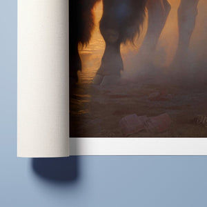 "Dusty" depicts a powerful buffalo amidst a golden, dusty backdrop. The painting conveys the grandeur of Western wildlife against the rugged landscapes of the Rocky Mountains, celebrating the raw beauty and spirit of the American wilderness.