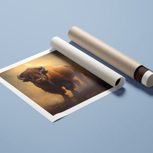 Buffalo with a dusty, golden backdrop, capturing the majestic essence of Western wildlife against the rugged terrain of the Rocky Mountains.